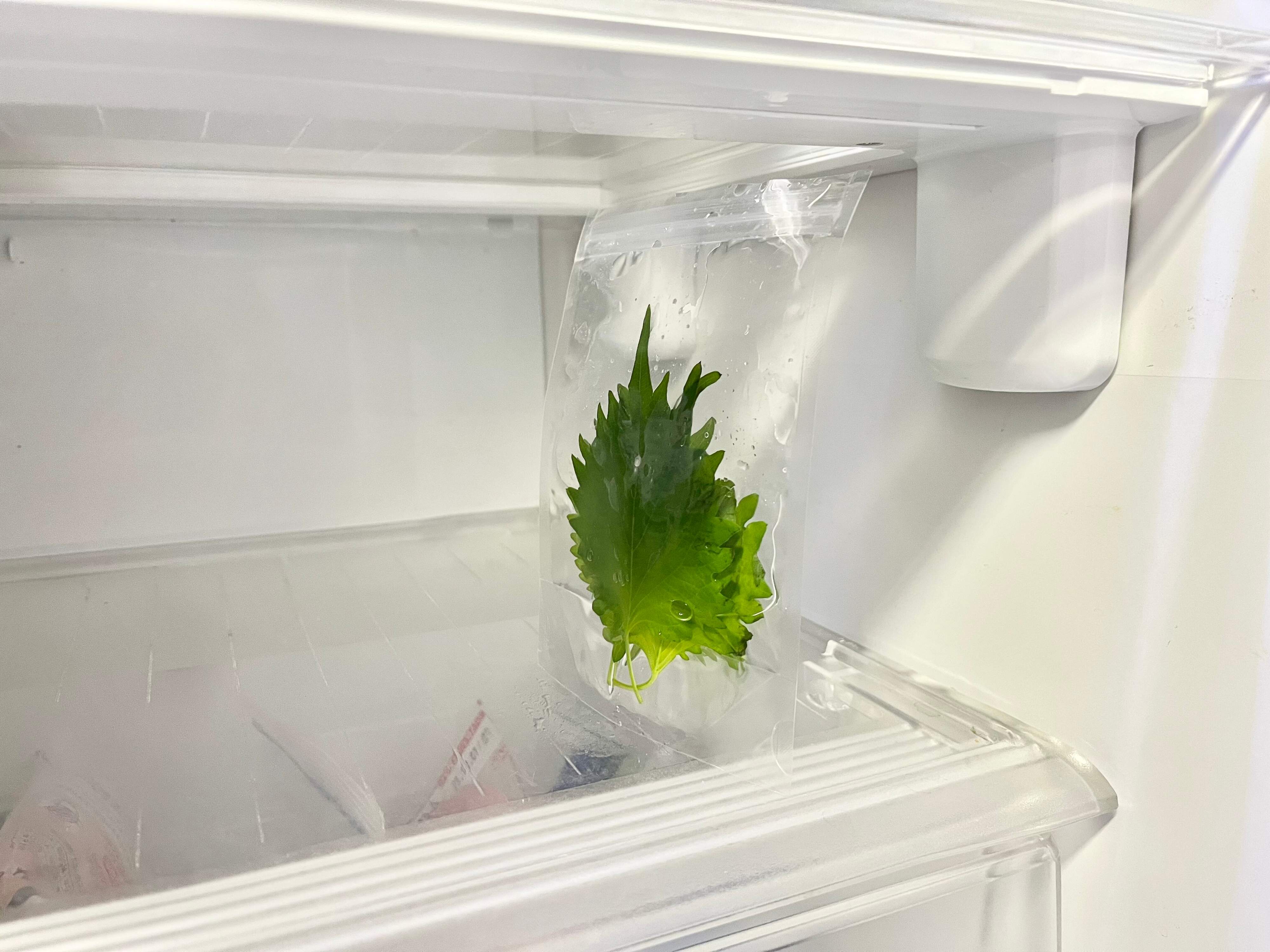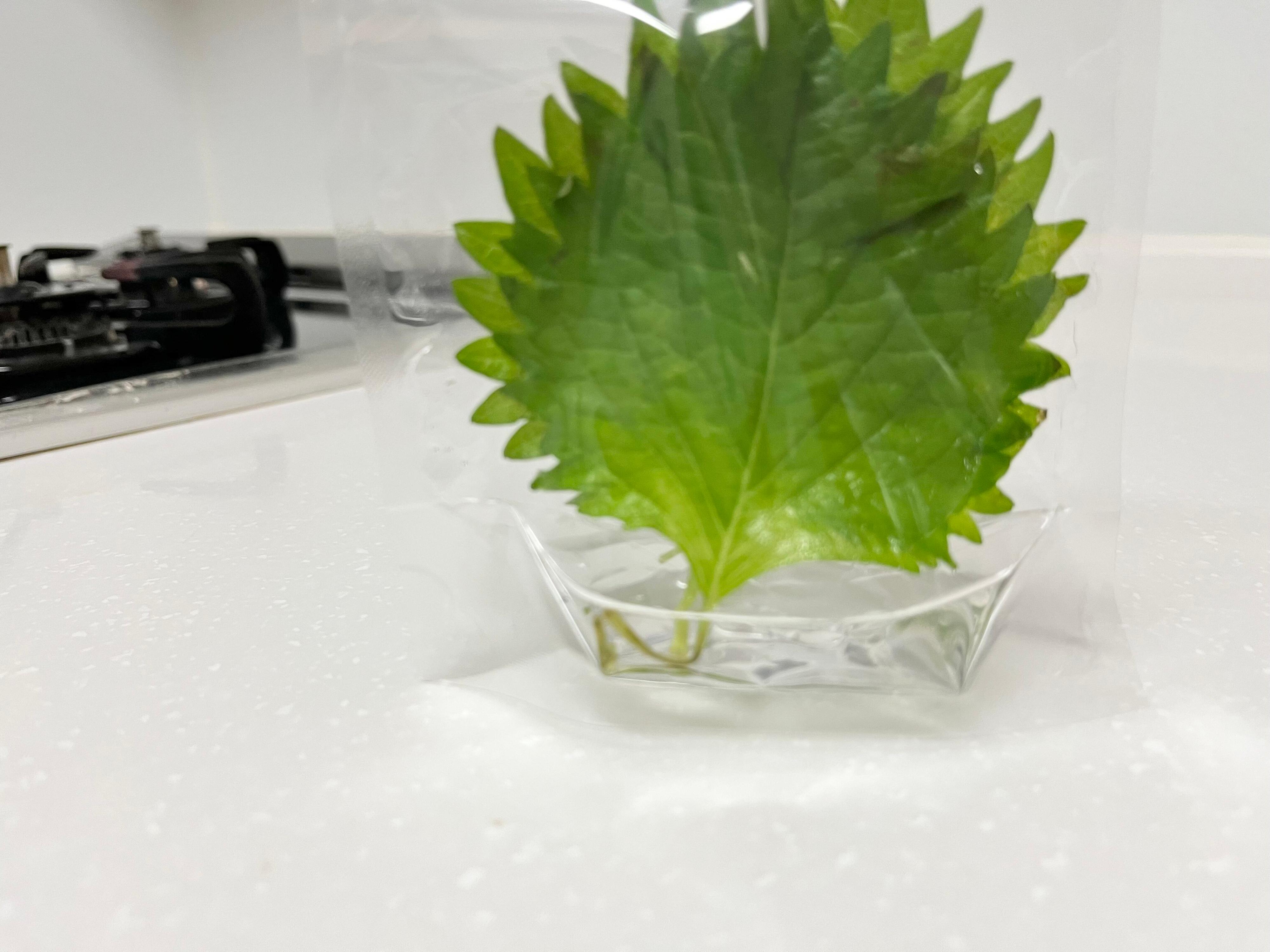 使い方は、まずジッパー袋を広げて底から1cm程度水を入れます。あとは茎を下にした状態で大葉を入れてジッパー袋の封をし、冷蔵庫で保管するだけ。