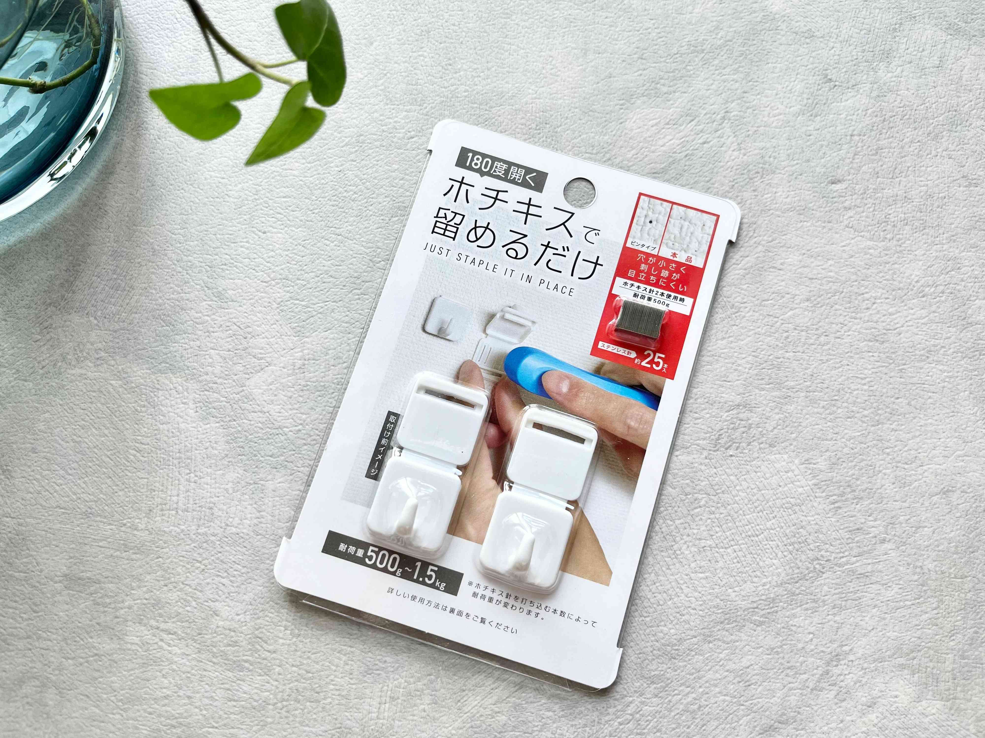 セリアの「ホチキスで固定する穴が目立たないフック」は、普段使い慣れたホチキスで取り付けられるから手軽さはピカイチ!しかも、手軽でかつ刺し跡も目立ちにくいなんて、とっても優秀ですよね?