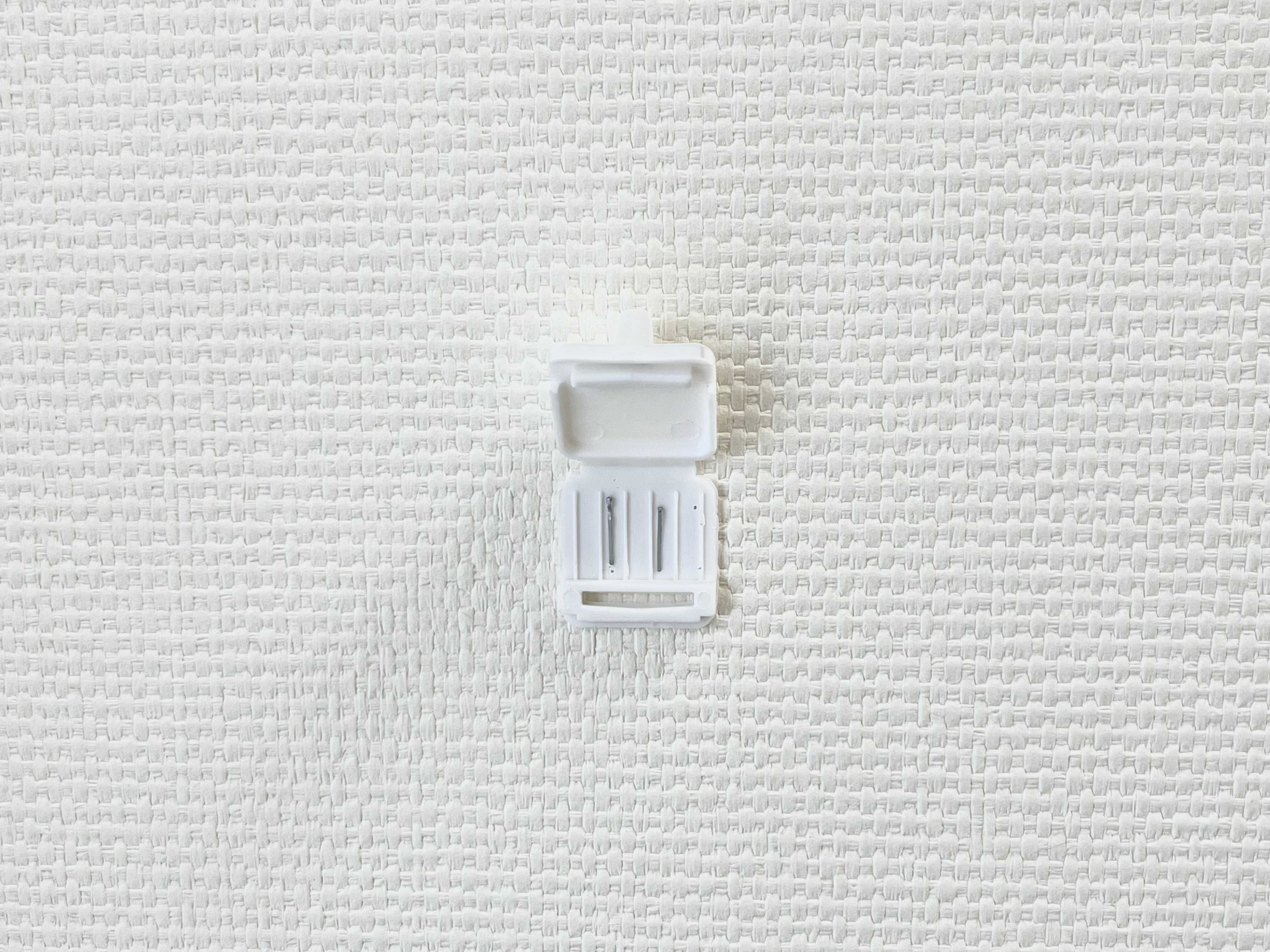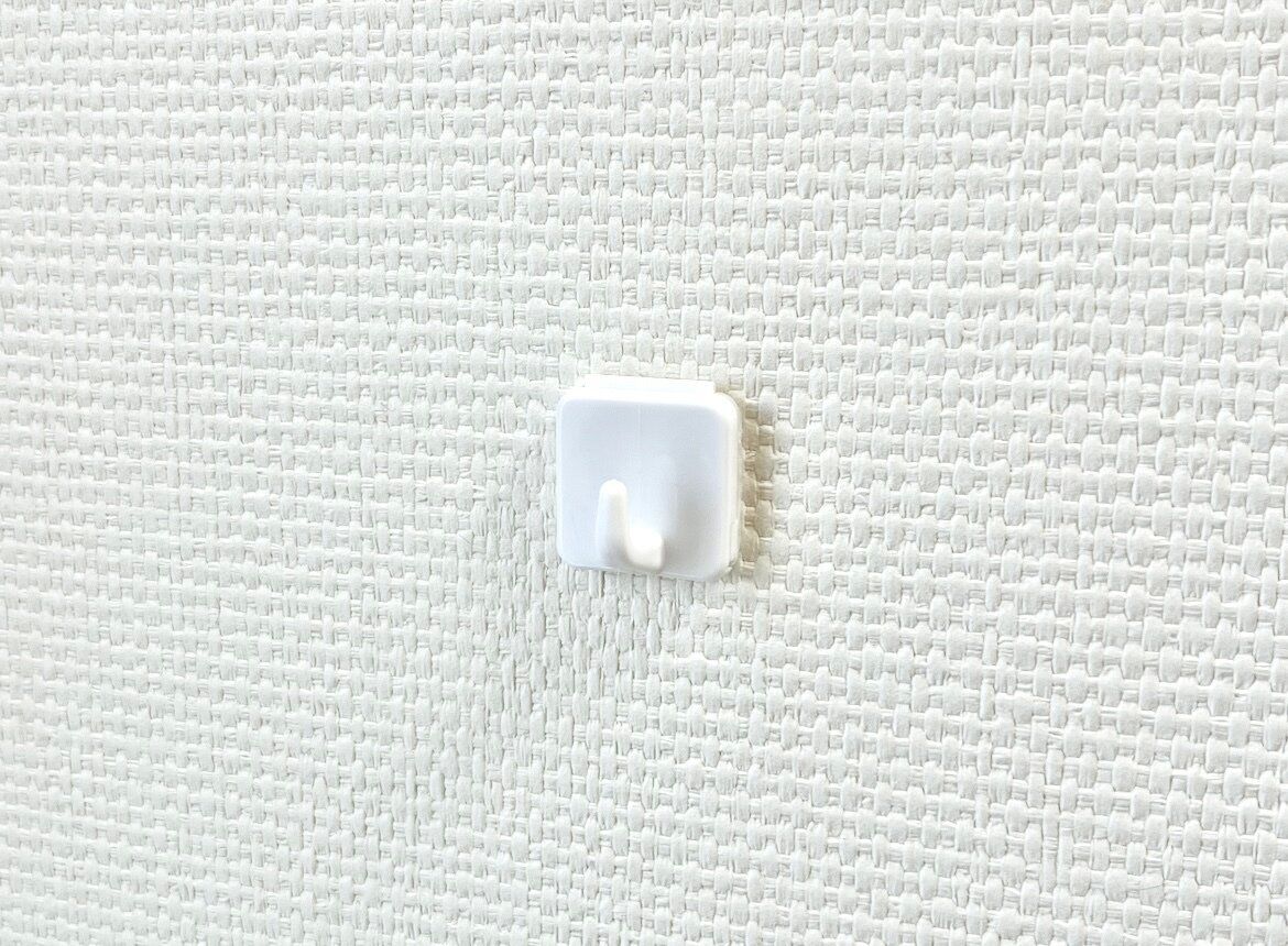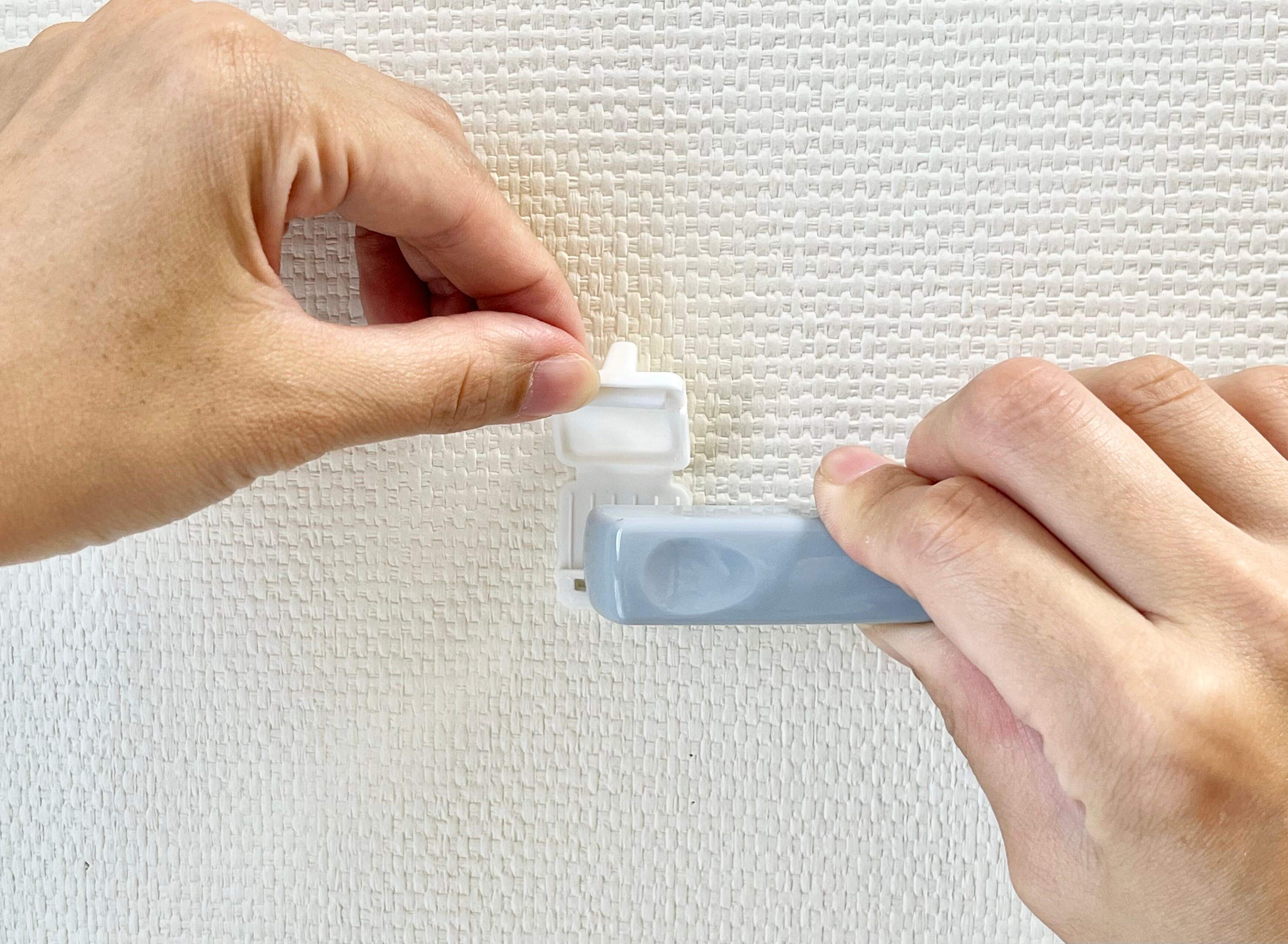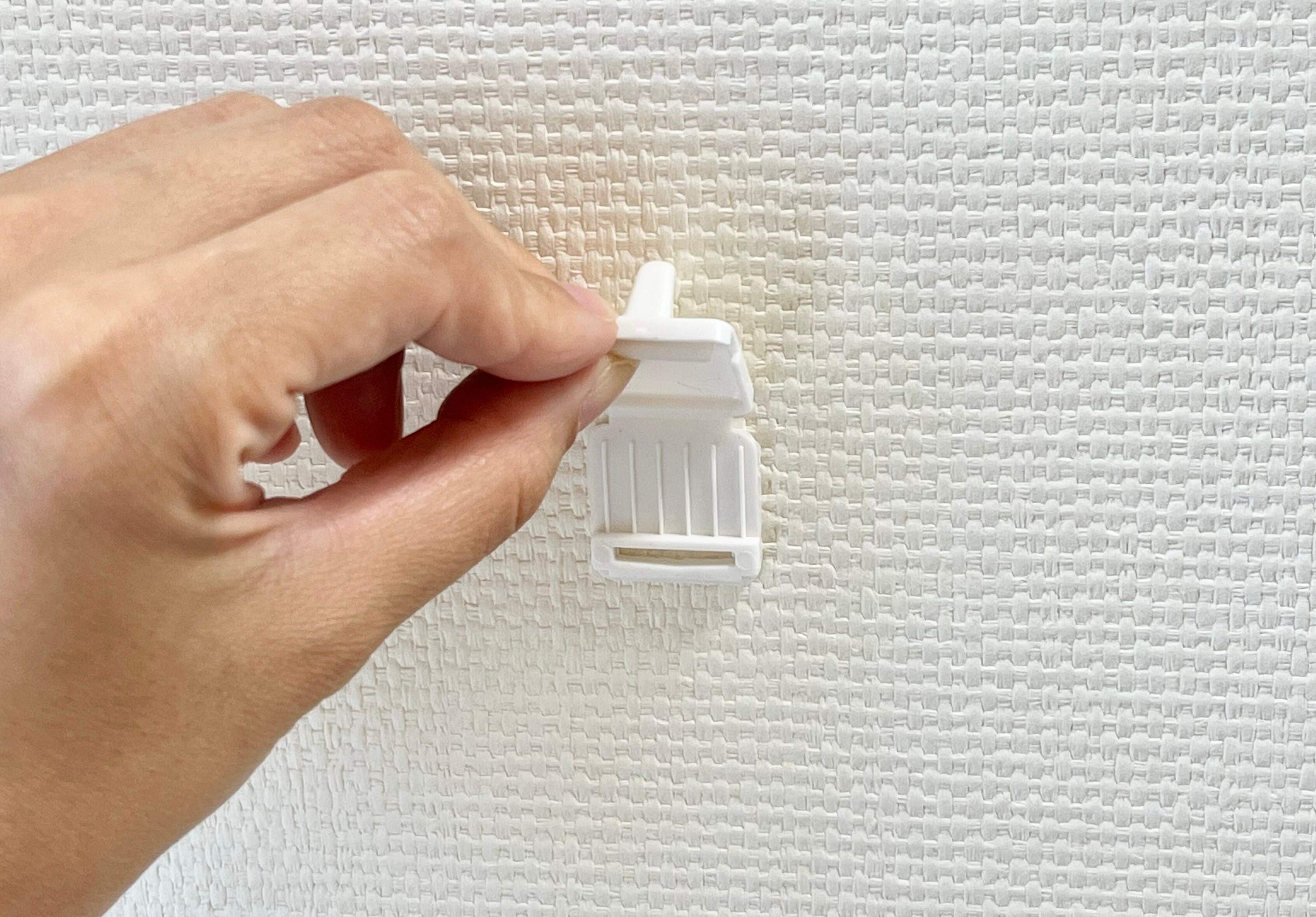 まずフックの蓋を開けて、フックを壁につけます。ちなみに、取り付けられる場所は石膏ボードの壁だけなので、取り付け前に壁の種類を確認してくださいね。
