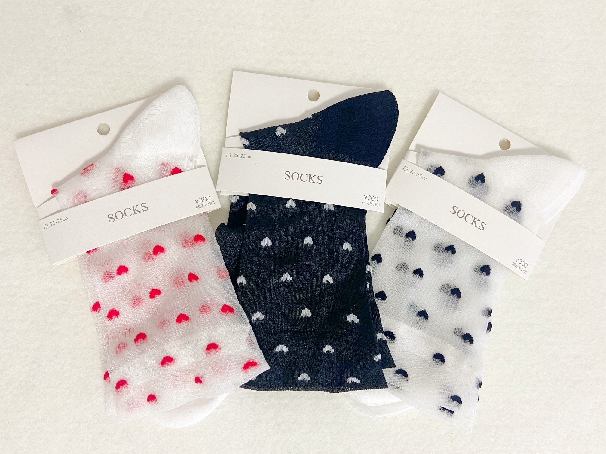 3COINSの「シースルーハートソックス」は全3種類。同じデザインでもカラーが違うと印象が変わるので、色違いで購入するのもアリ!