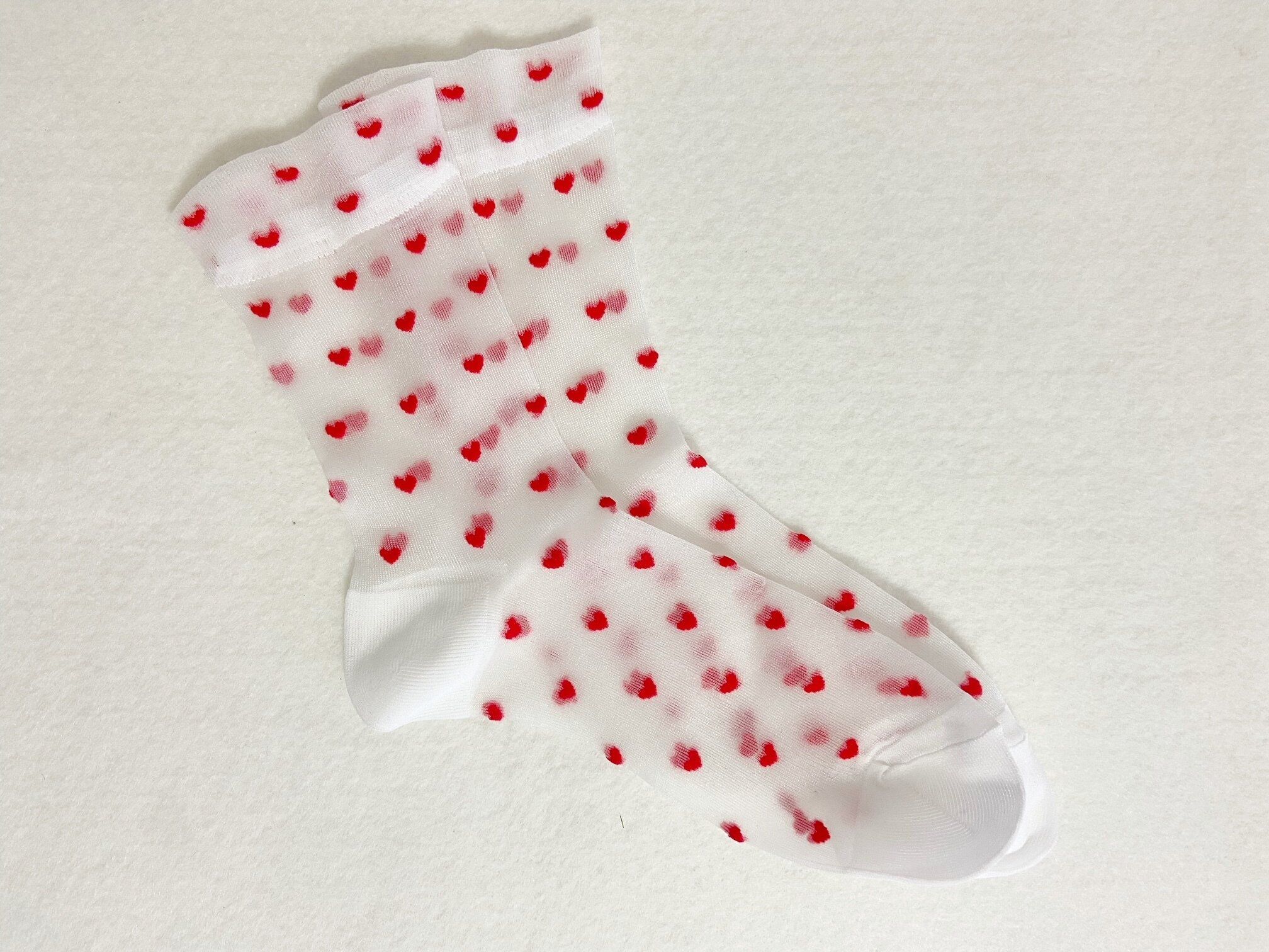 「シースルーハートソックス」(330円)は、春のコーディネートに大活躍してくれるデザインのソックスです。スニーカーはもちろん、パンプスやサンダルなどに合わせることで同じ靴でも印象ががらりと変わり、コーディネートのワンポイントになりますよ。