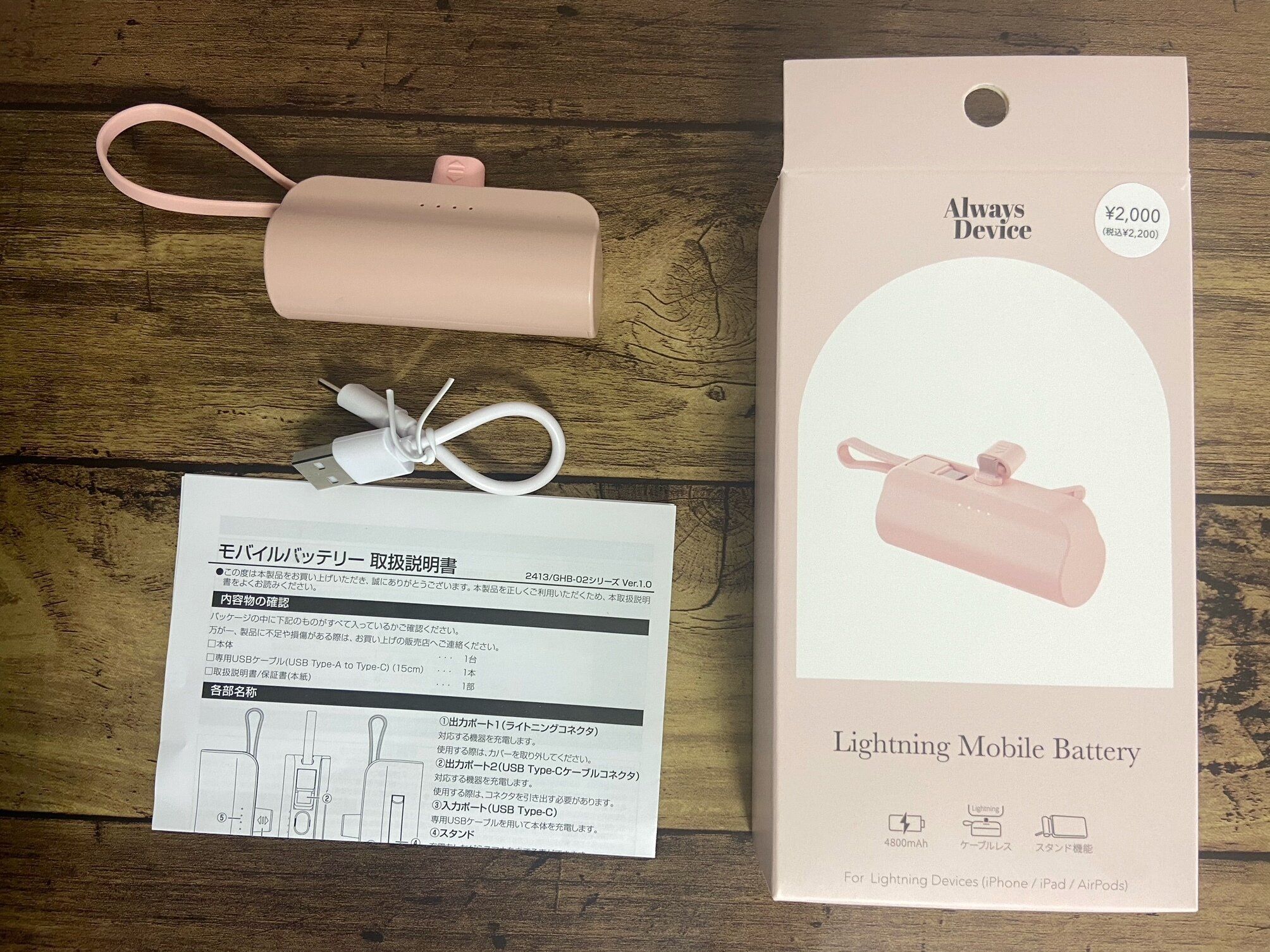 セット内容はモバイルバッテリー本体と充電用のケーブル(USB Type-C)、取扱説明書兼保証書の3点です。本体は4,800mAhで、約1.5回分充電ができます。