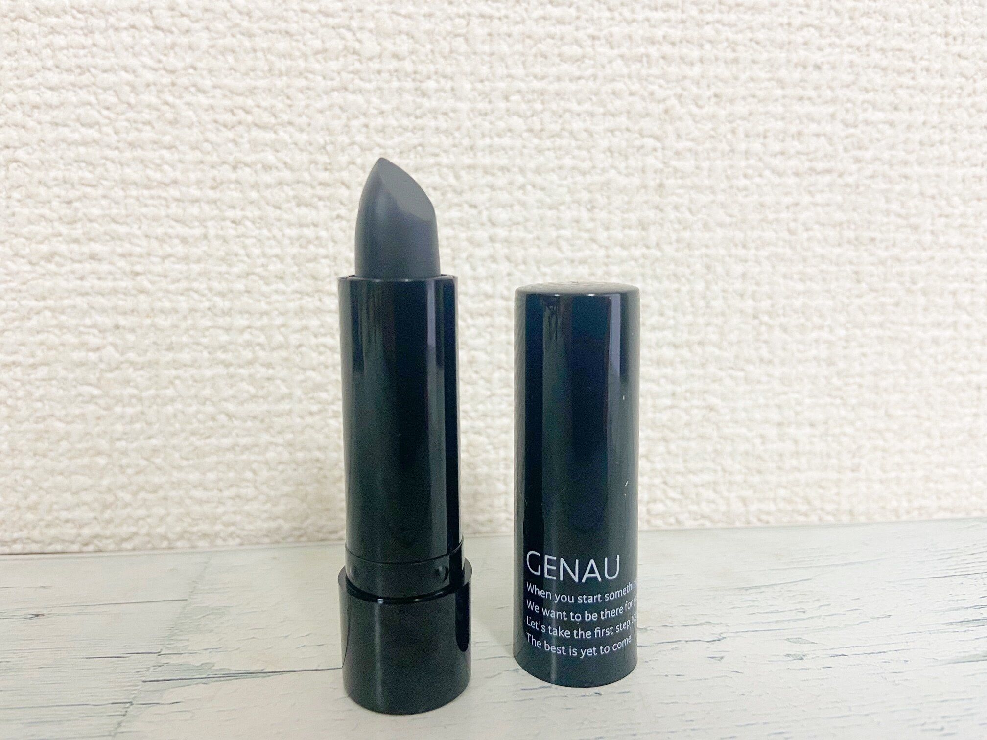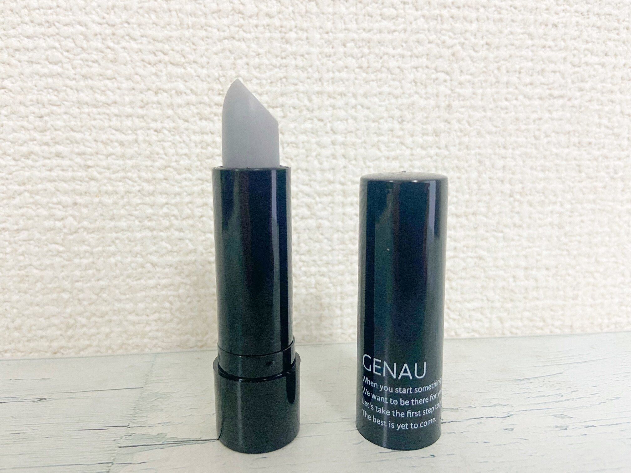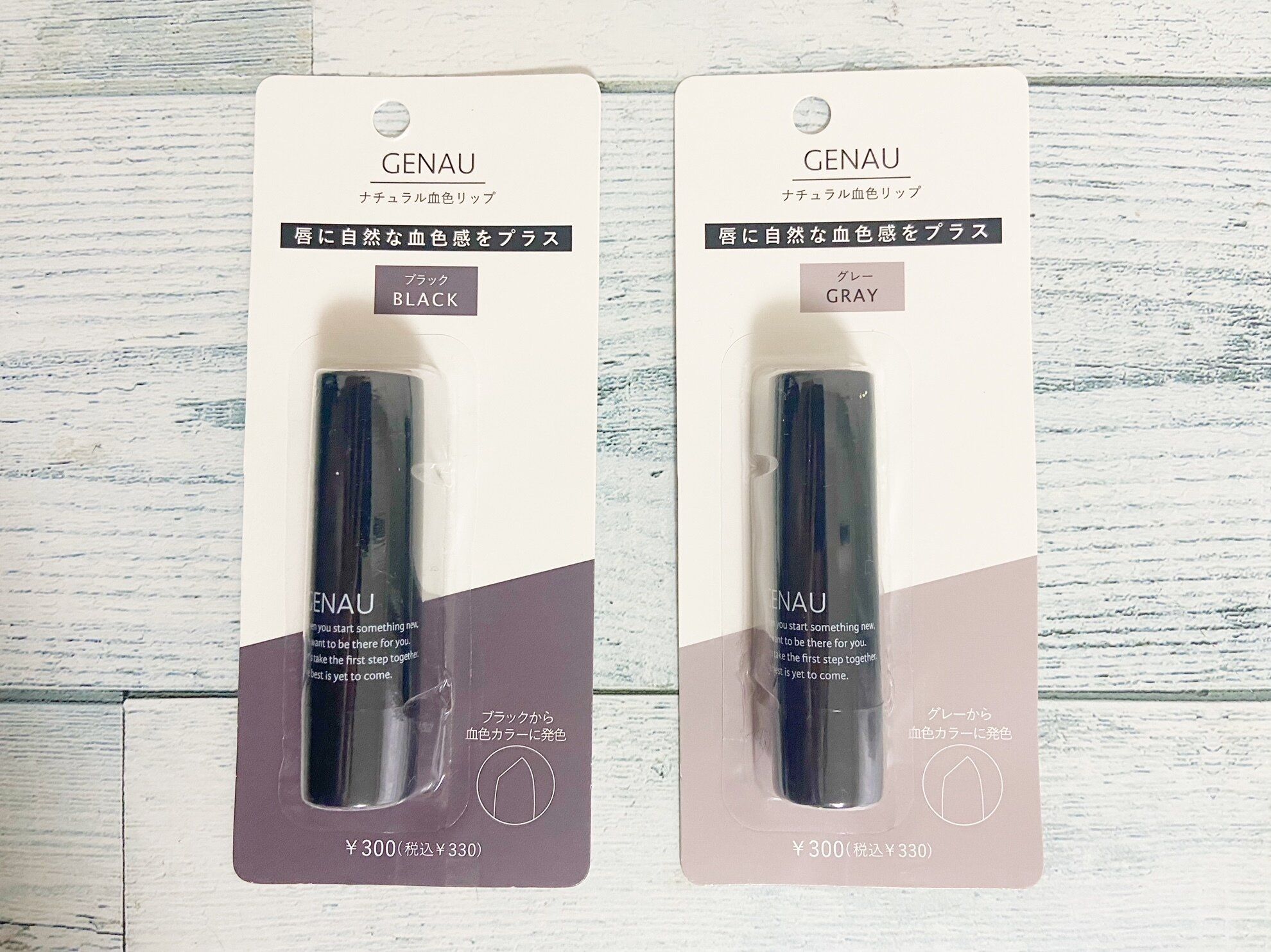 数あるラインナップの中から筆者が選んだのは「《自然な色に変わる》ナチュラル血色リップ/GENAU」(330円)。カラーバリエーションはグレーとブラックの2色展開です。「え?!そんなカラーのリップってアダムスファミリーになっちゃうよ?」と思った人も安心してください。唇に付けると本当に薄付きなので、グレーやブラックには発色しません。