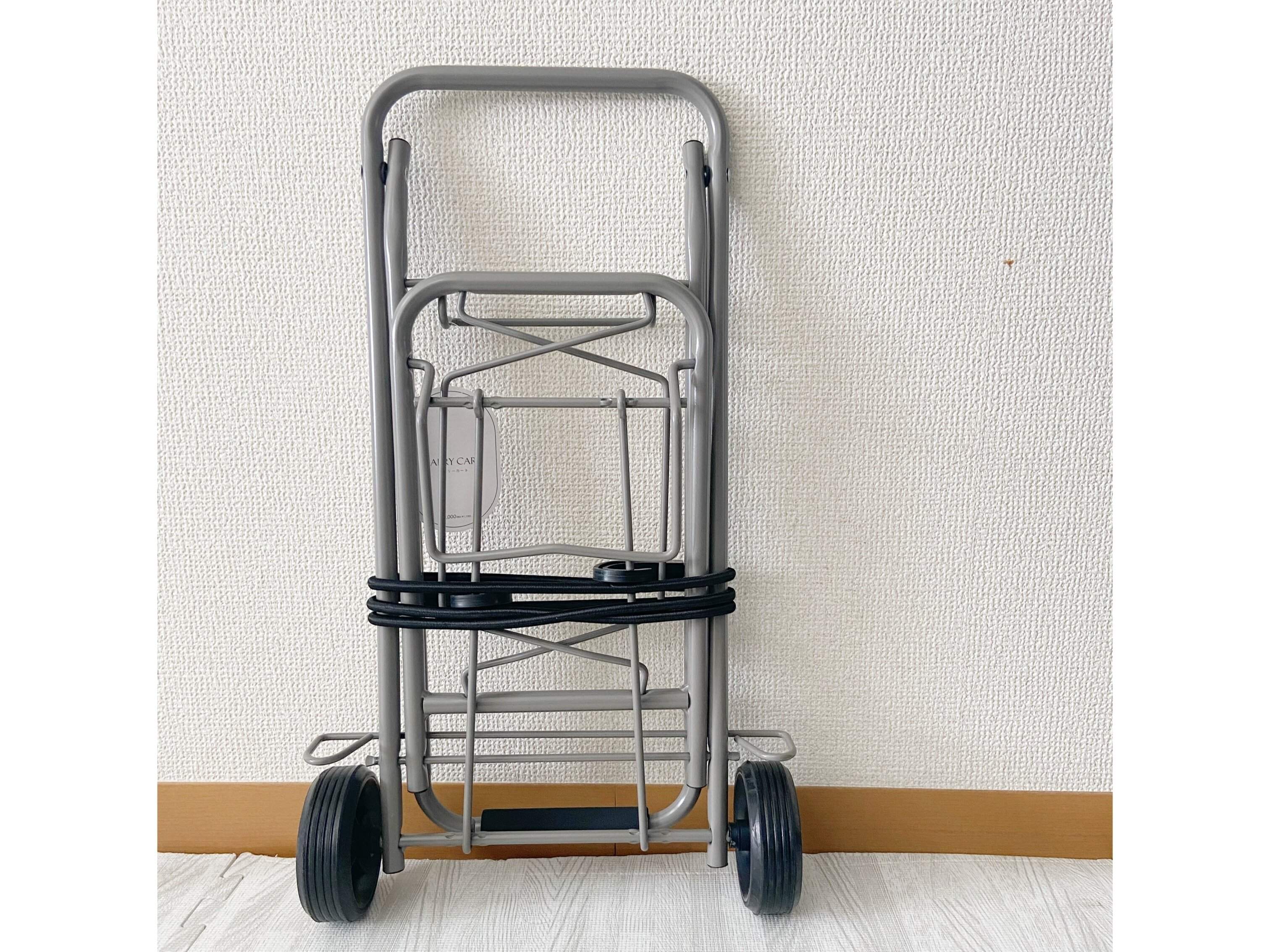 サイズは折りたたんだ状態で約縦51×横31×マチ9.5cm。使う時は持ち手が1mほどになります。耐荷重は約12kgと割としっかり荷物を運ぶことができるのに1,100円というプライスはなかなかの破格。ほかのメーカーのものだと同じような性能なら安くても3,000円前後はしているものがほとんどです。