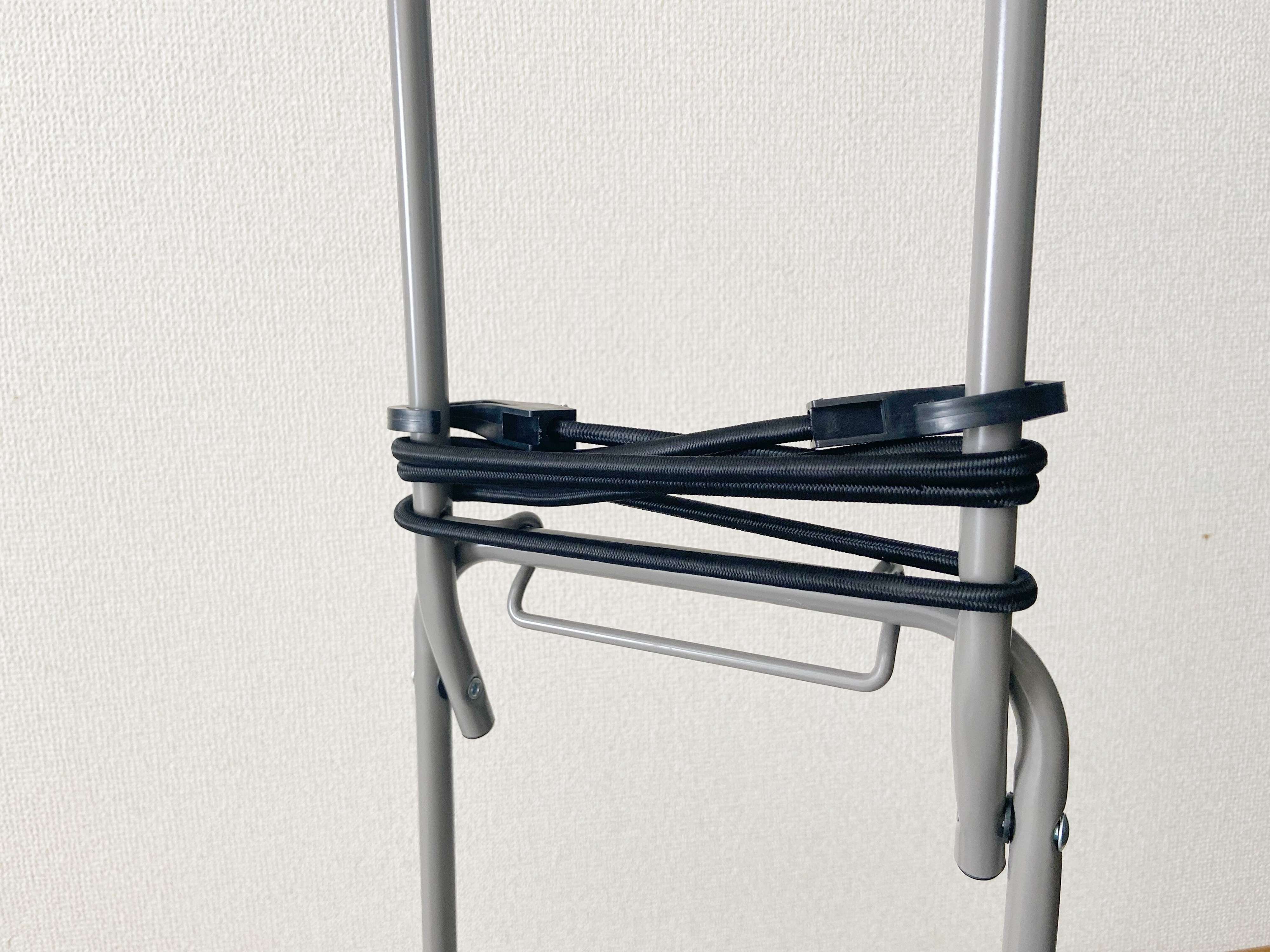 この「キャリーカート」には、荷物やコンテナを固定するために使う伸縮性のあるロープがセットになっています。使わないときやしまっておくときは持ち手部分に巻きつけて置けるのでなくす心配もありません。