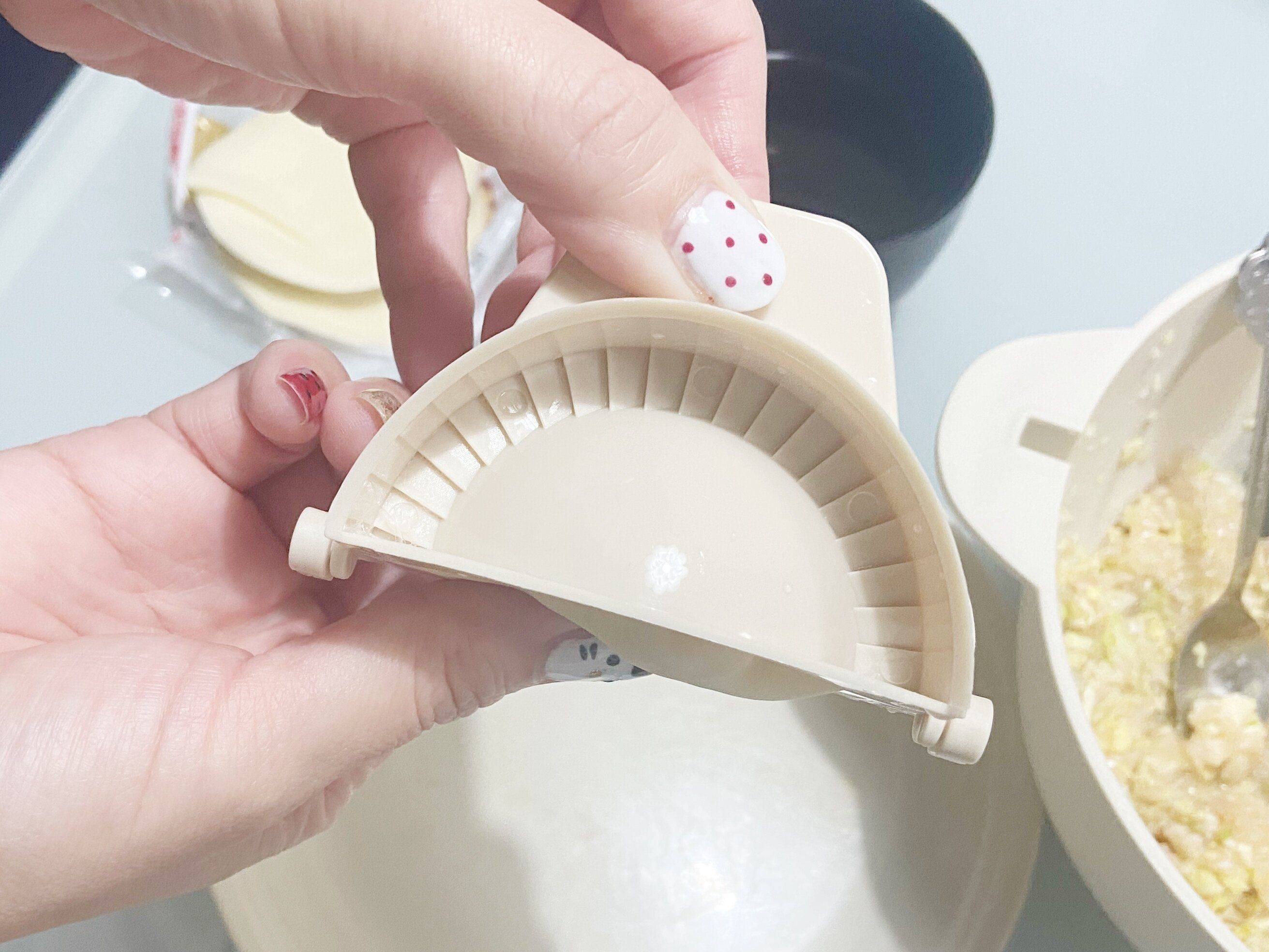 早速筆者も「餃子メーカー」を使って餃子作り。まずは餃子の餡を中央にのせます。あまりたくさんのせすぎると挟むときにはみ出してしまうので、気持ち控えめにするのがおすすめです。ちなみに、この日の餃子の餡は白菜と鶏ひき肉ににんにく・生姜をたっぷり混ぜて、中華だしの素をプラス。