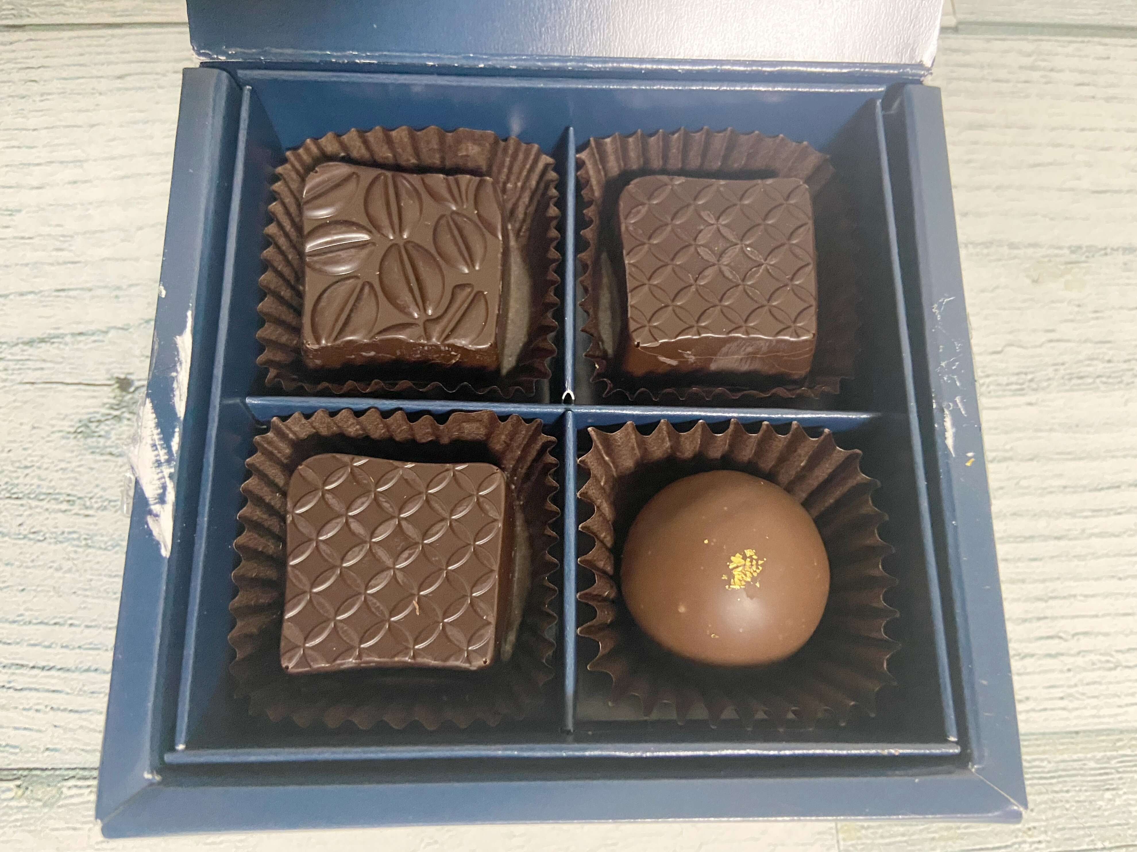 ギフトチョコレートAはカフェを購入。紅茶やコーヒーの風味がプラスされたチョコレートが4個入っています。一粒一粒満足感のあるチョコレートです。