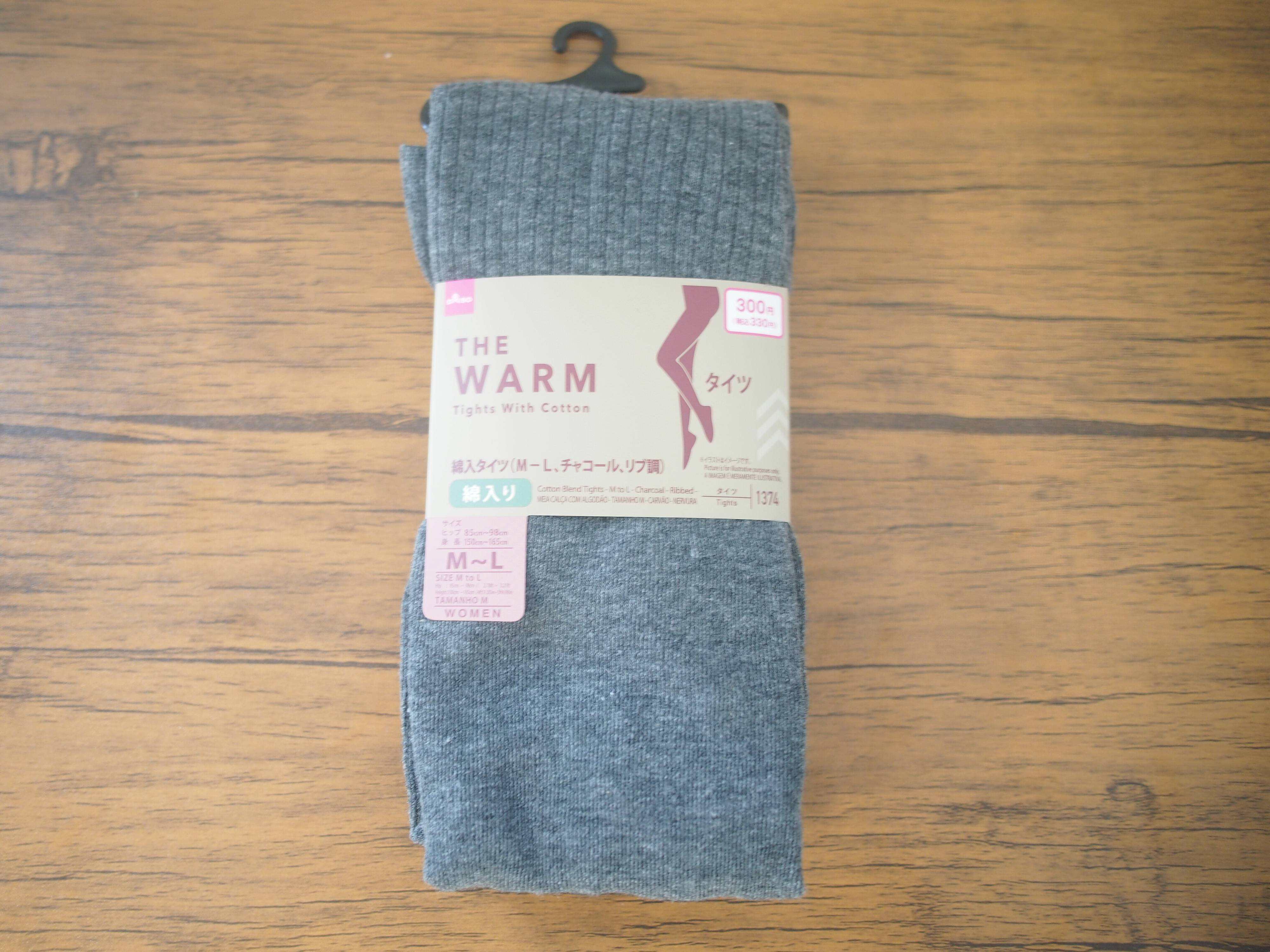 はじめに紹介するのが、綿入のタイツです。生地がしっかりとしたタイツが330円で販売されています。衣料品店で購入すると500円以上するのでかなりオトクですよね。伸びがよくスルスルと履けるので、いそがしい朝もパパっと履くことができます。肌あたりもよく、チクチクしないのもうれしいポイント。
