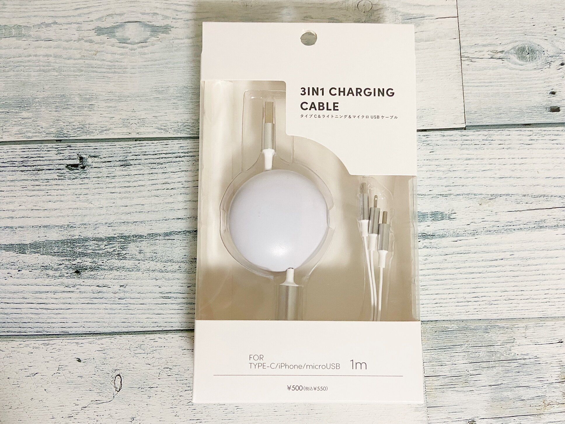 今回ご紹介するのが「3in1ケーブル」(550円)。カラーはホワイトとブラックの2色展開で発売されています。ふだんのお出かけや旅行で持ち歩くのにピッタリのデバイスアイテムです。