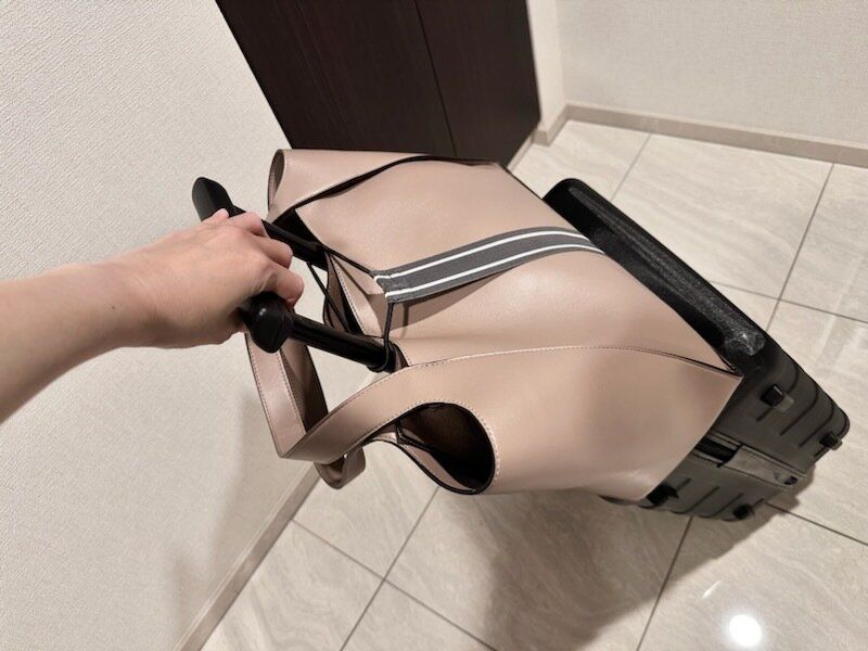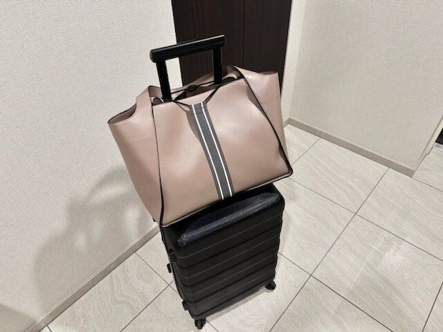 バッグがしっかりと固定されるので、スーツケースを斜めにしてもバッグがズレ落ちることもなく、快適に移動することができるんです!