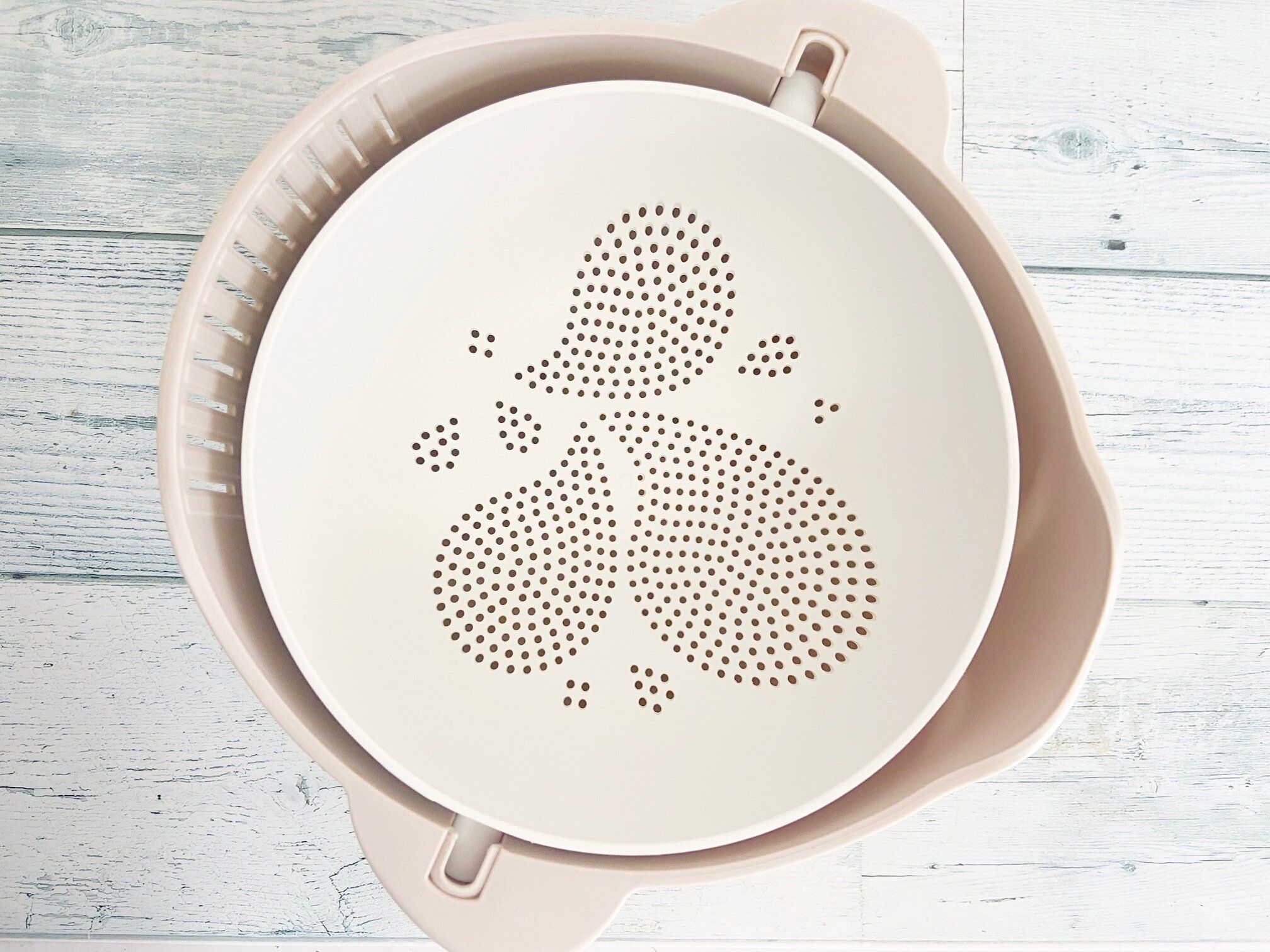 改良されたポイントの一つが「ザル」のデザイン。旧バージョンはかわいらしい絵柄のようなデザインに沿って全体的に穴が開いています。新バージョンと比べると機能性よりもデザイン性を重視しているような印象。(使用感は満足して使っていましたよ!)