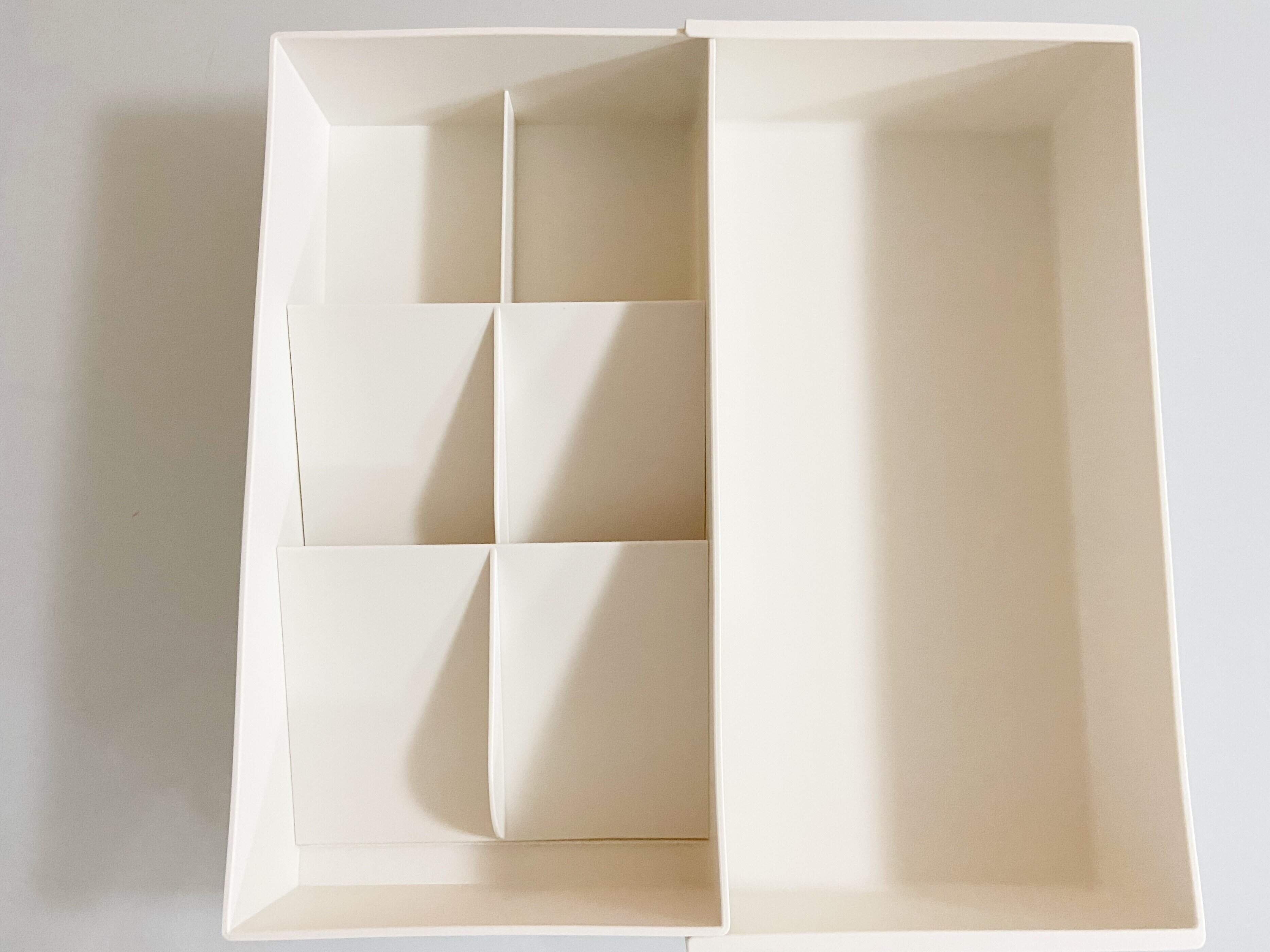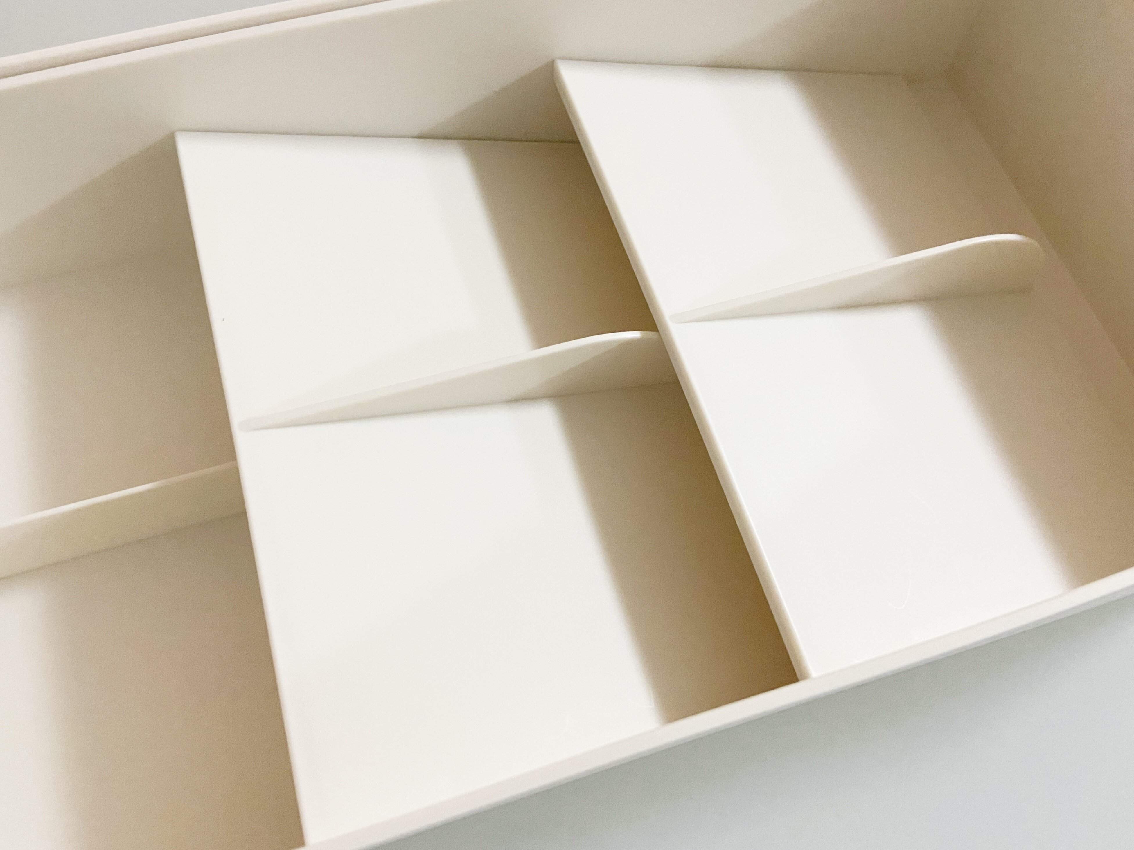 カトラリーは縦に、そして斜めに収納できるので取り出しやすいだけでなく収納場所も省スペースで済みます。しかもこの仕切りは取り外しが可能なのでお手入れも簡単です。