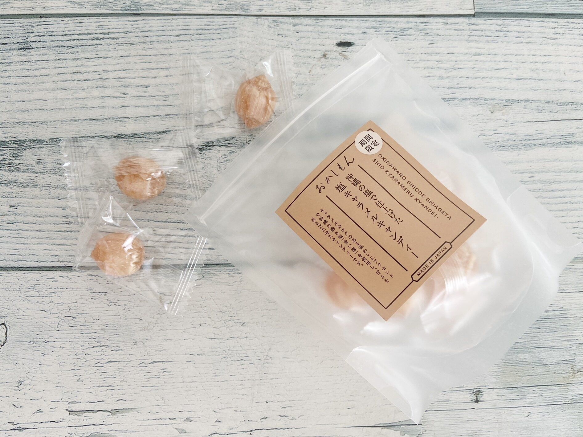 「沖縄の塩で仕上げた塩キャラメルキャンディー」(216円)は塩を使用することで、キャラメルの甘さをより引き立てるお味に…。甘いお菓子が好きな人にとくにおすすめのおかしもんです。袋もジップつきなのでこのまま持ち歩けるのもうれしいポイント。
