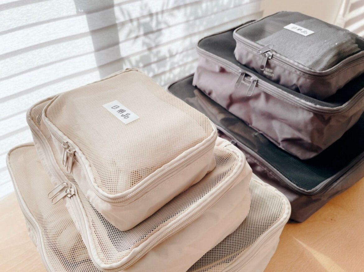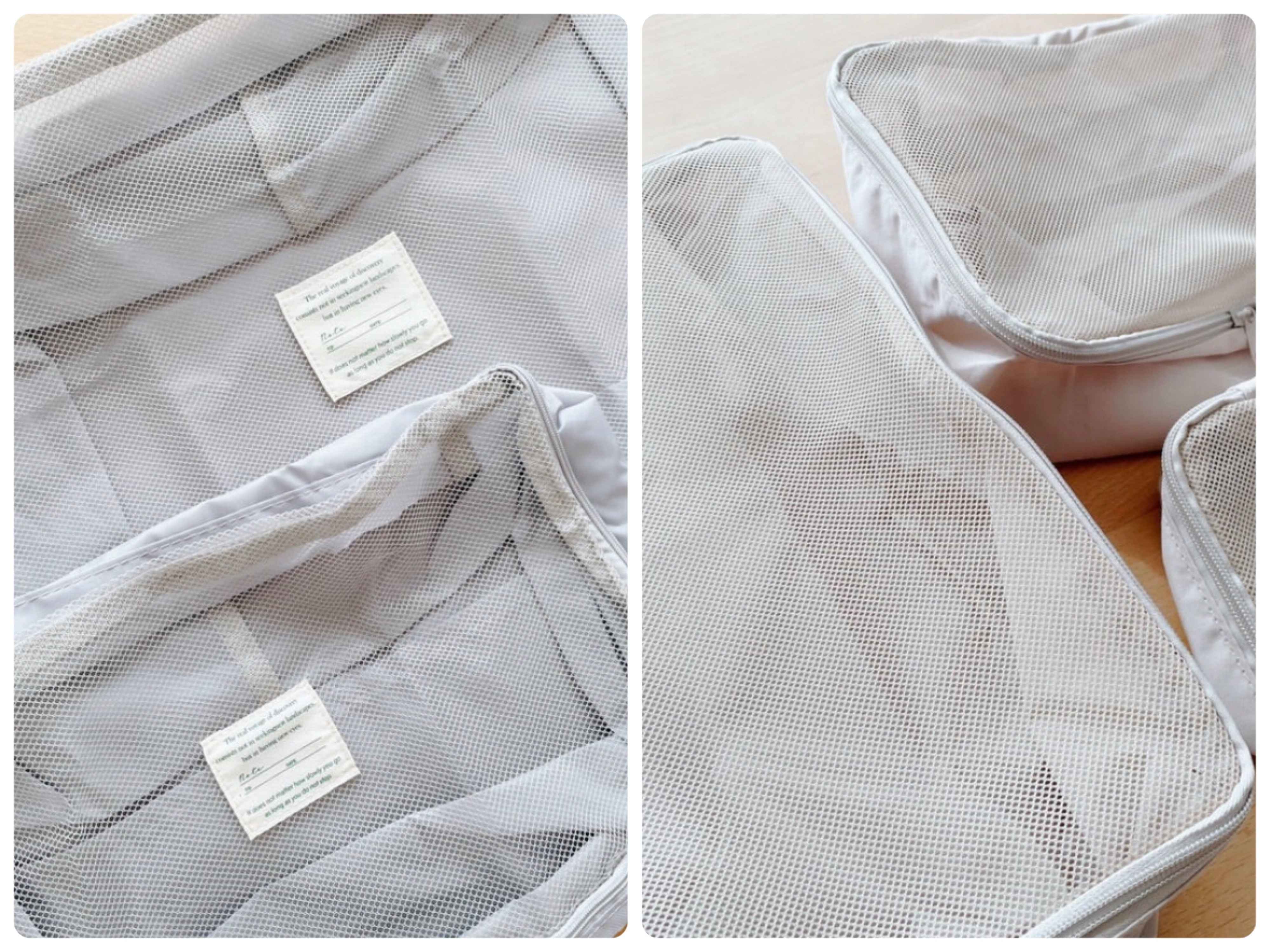 衣類圧縮はできないですが、片面がメッシュで通気性がよく中身が見えて探し物がないのは同じ。取っ手もあるので持ち運びも便利。3サイズのセットなので消耗品、お風呂セット、衣類というようにきれいに仕分けることができるので、旅行準備も片づけも楽ちんです。