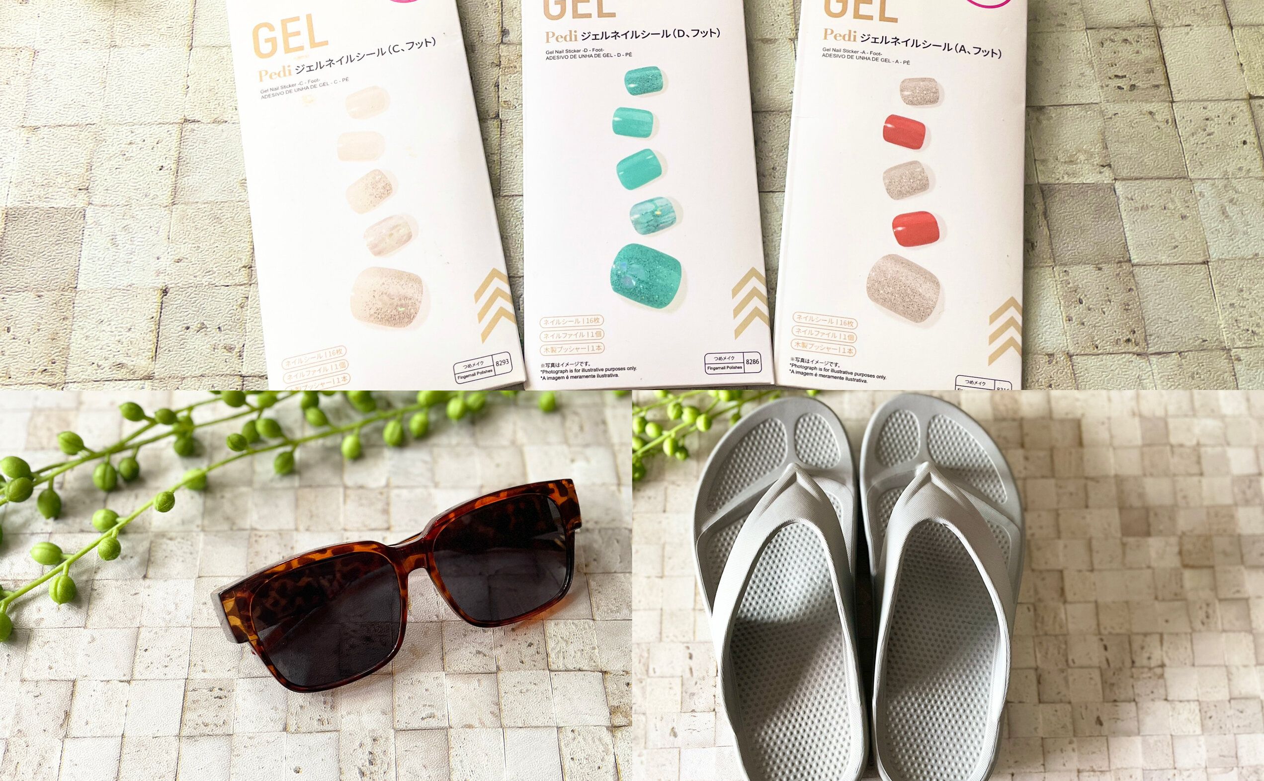 ダイソーの「フット用ジェルネイル」と「オーバーサングラス」、「サンダル」の夏アイテムで、この夏が快適に過ごせそうです。