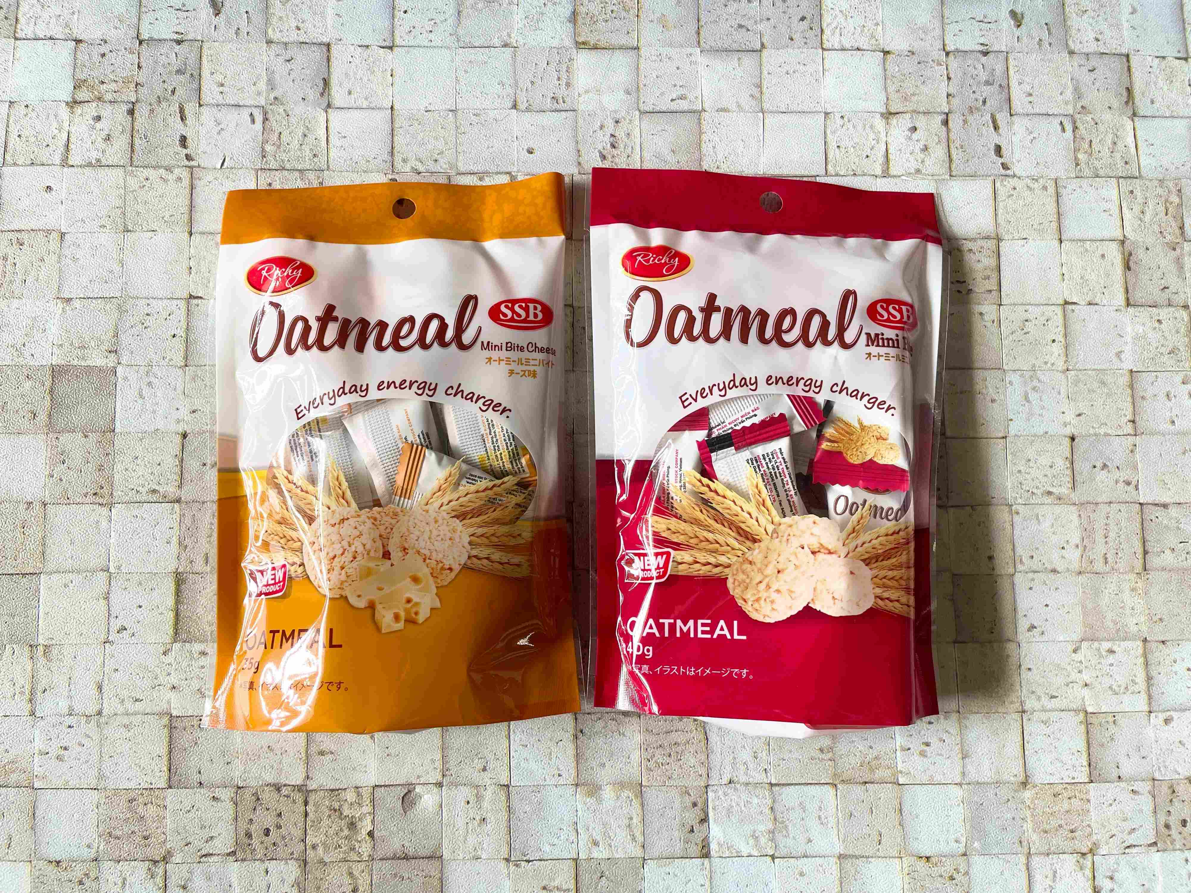 私が購入した店舗では「オートミールミニバイト」と「オートミールミニバイトチーズ味」の2種類がありました。
