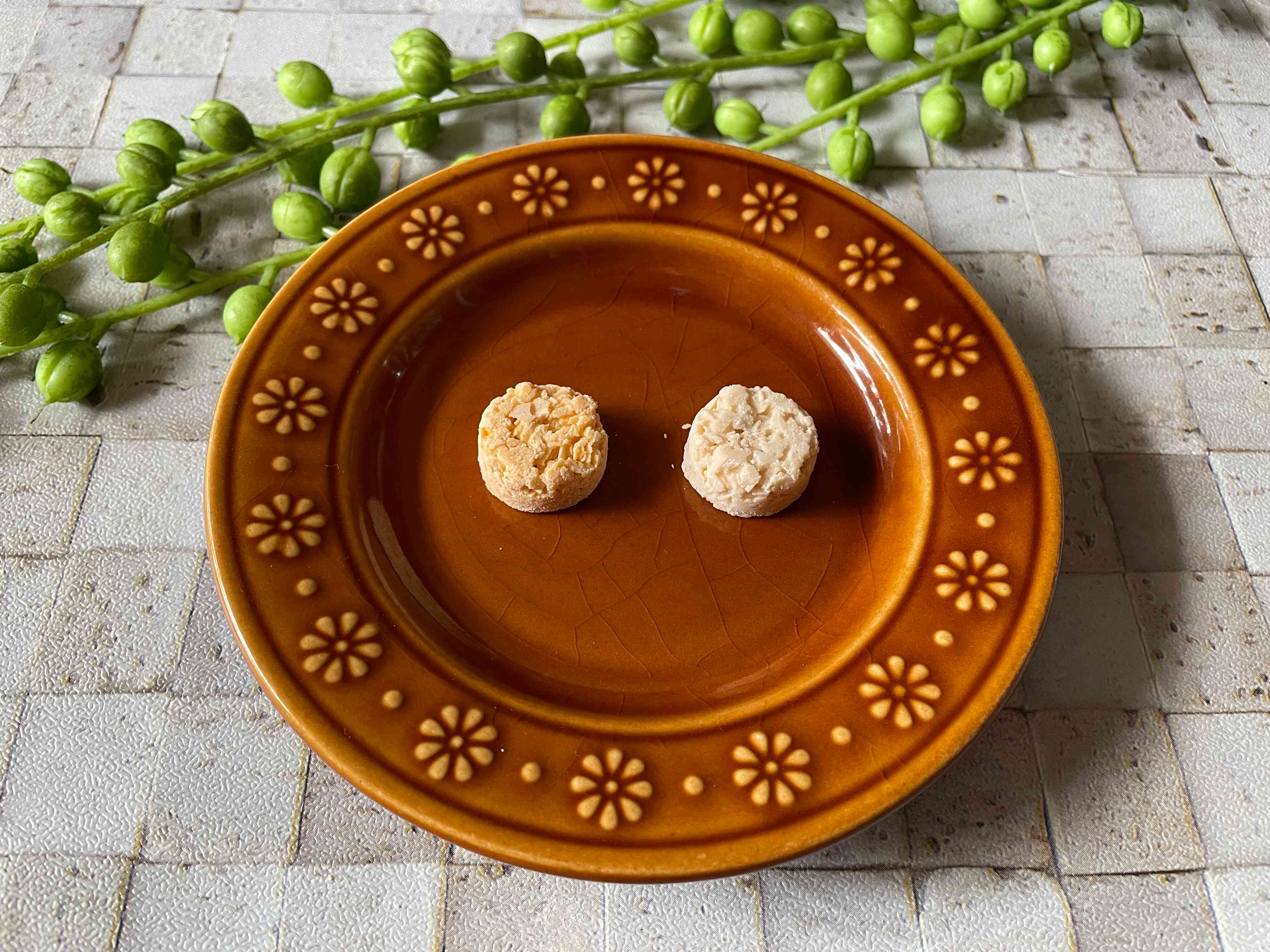 中身はクランチチョコのような見た目です。サイズは2cm弱程度で大きさもキャンディくらい。チーズ味のほうが若干黄色くて、ノーマルは白い色ですね。