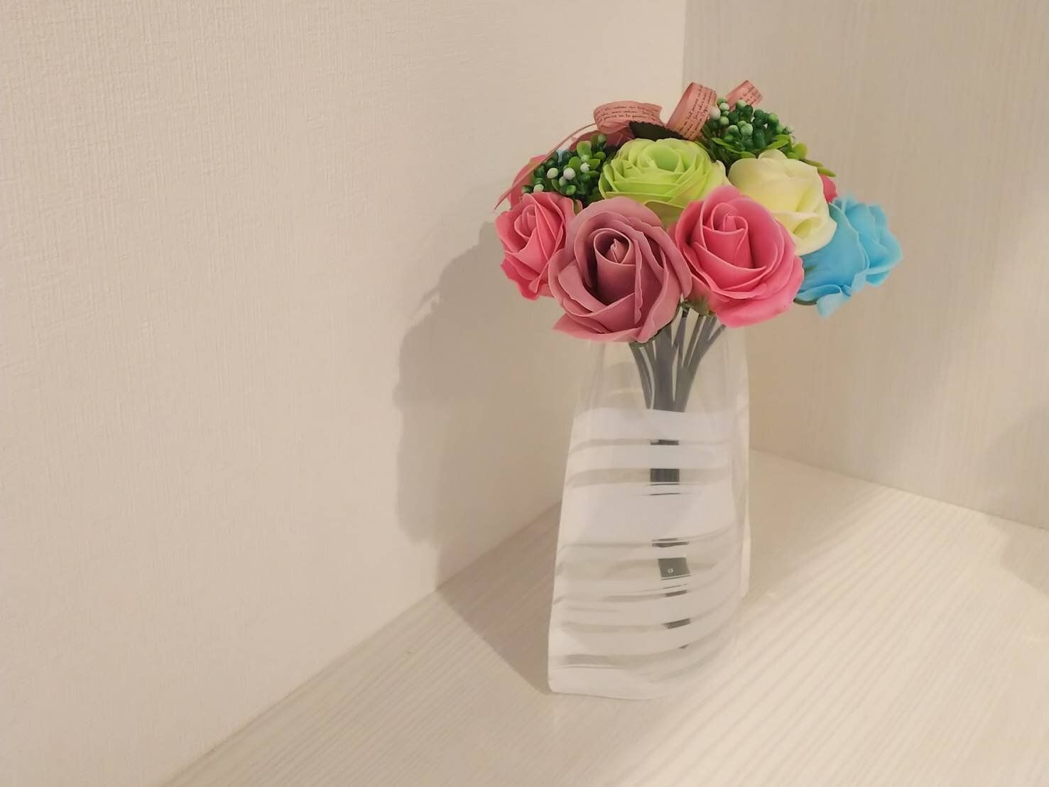 今回サイズが合うお花がなかったので、自己責任で上部をカットし、安定した場所に飾ってみましたが、ちょっと透明な感じがおしゃれです。なかなかガラスの花瓶では出せない雰囲気を出してくれています。