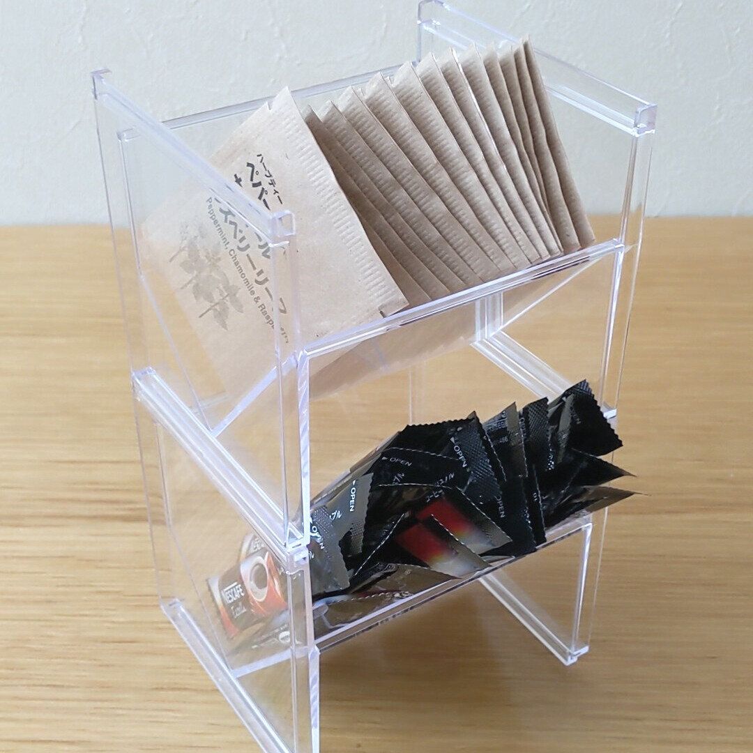 ティーバッグはもちろん、袋止めクリップの収納や、洗面所で日焼け止めなどの収納にも使えて便利です。
