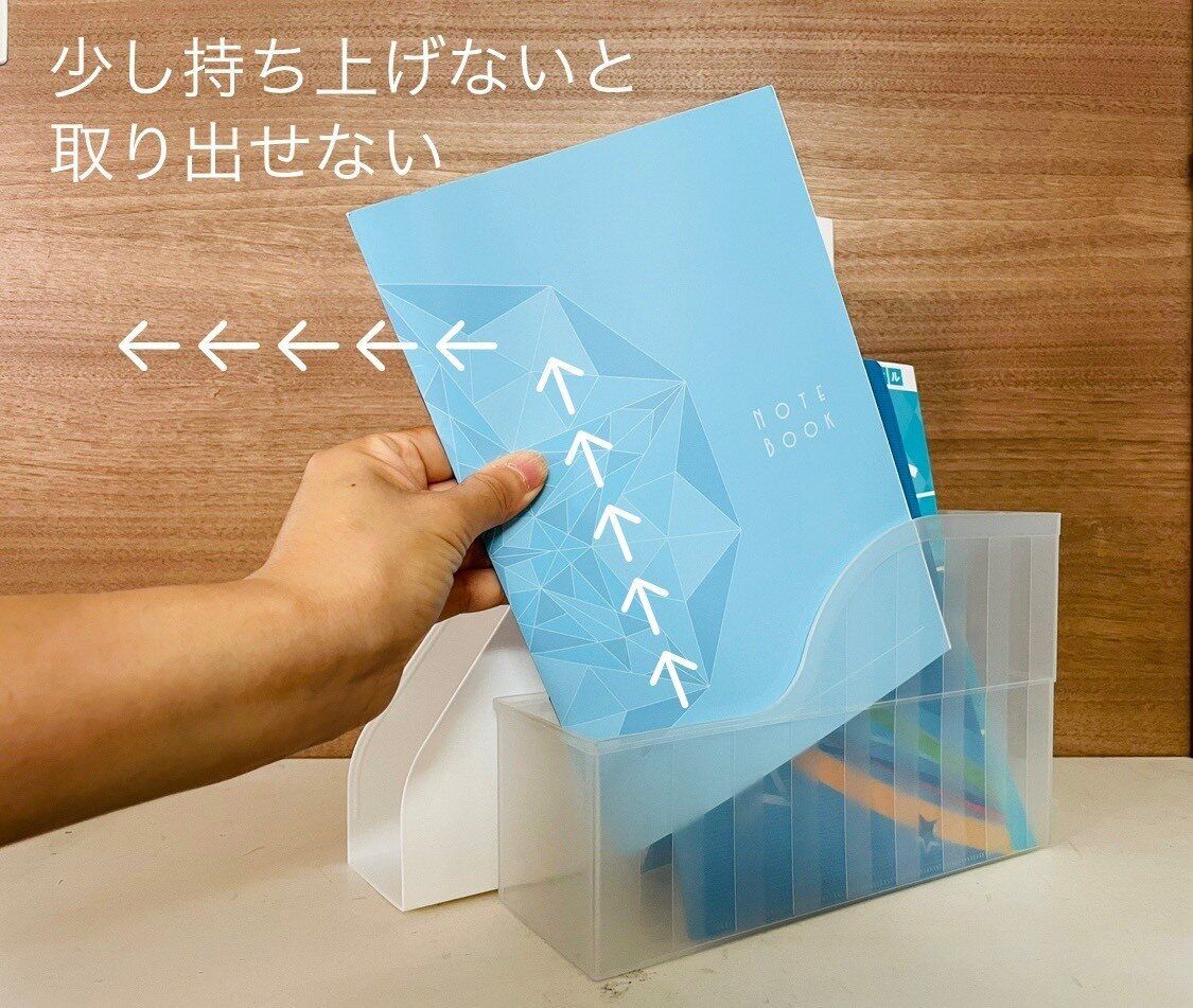 このように、さまざまな収納に使えるA4ファイルスタンドですが、私がおすすめする収納方法は「書類整理」です。なぜなら、手前の立ち上がりがないので、書類やノート、ファイルなどの出し入れがとてもスムーズになり、片づけが苦手な人にとても使いやすいからです。