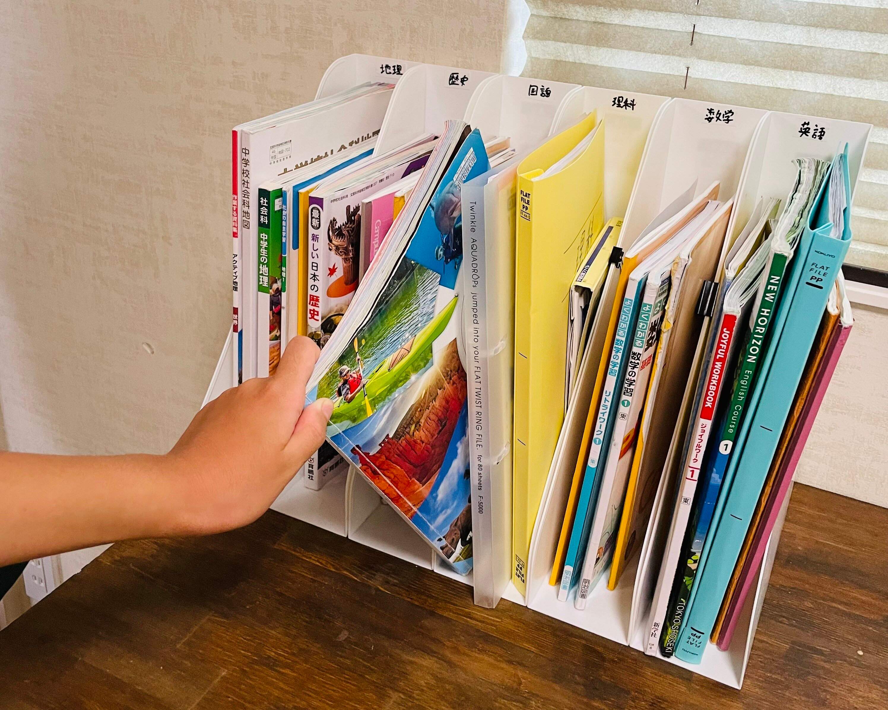 実際、我が家ではもうすぐはじまる新学期に向けて、新たにA4ファイルスタンドを購入。中学生の教科書収納の見直しをして、教科ごとに分けて収納することにしました。