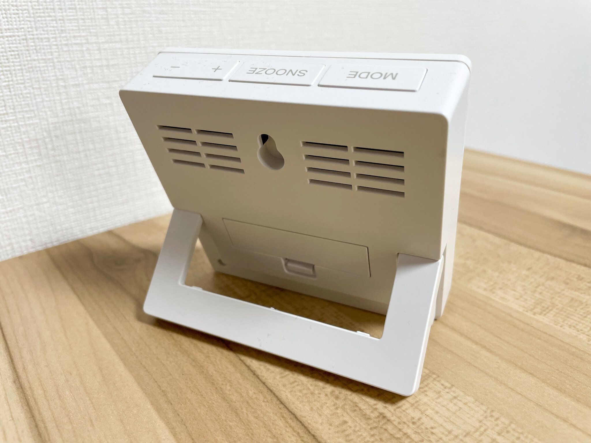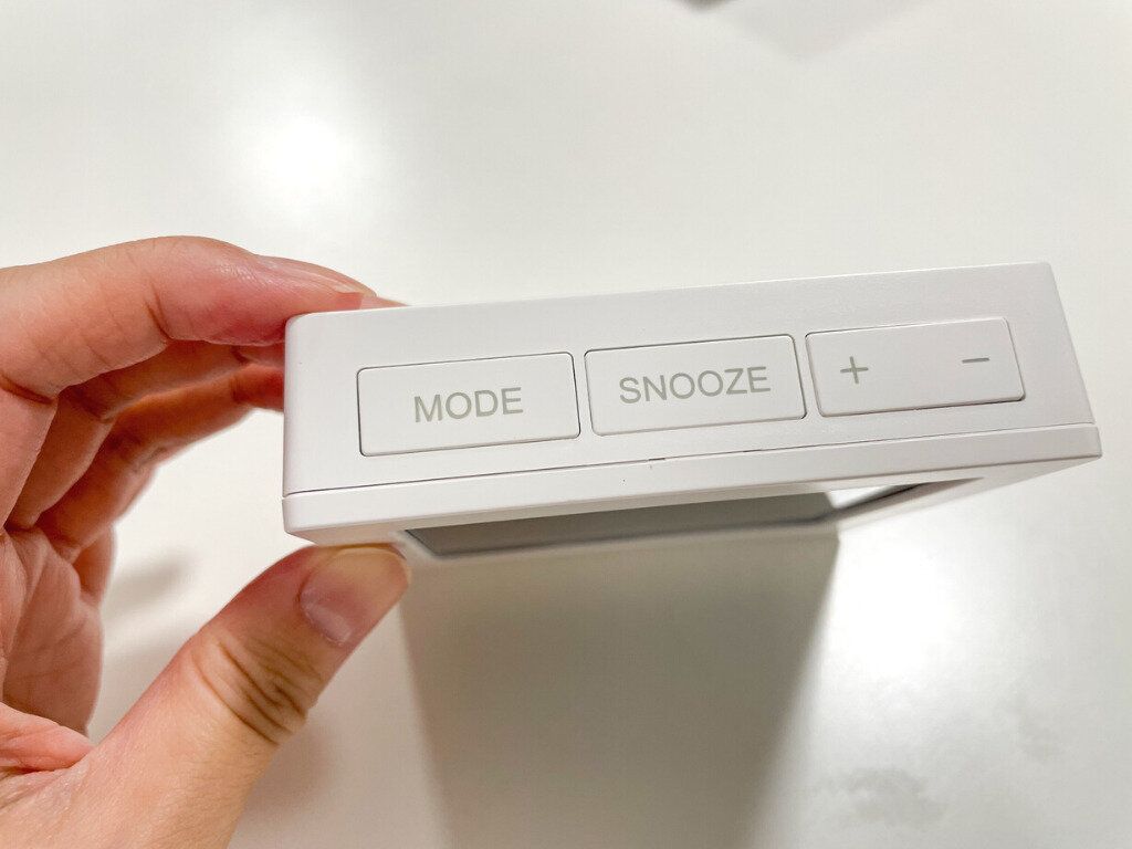 「MODE」と「+ -」ボタンで目覚ましの時間をセット。「SNOOZE」ボタンもあるので目覚まし機能もバッチリです。