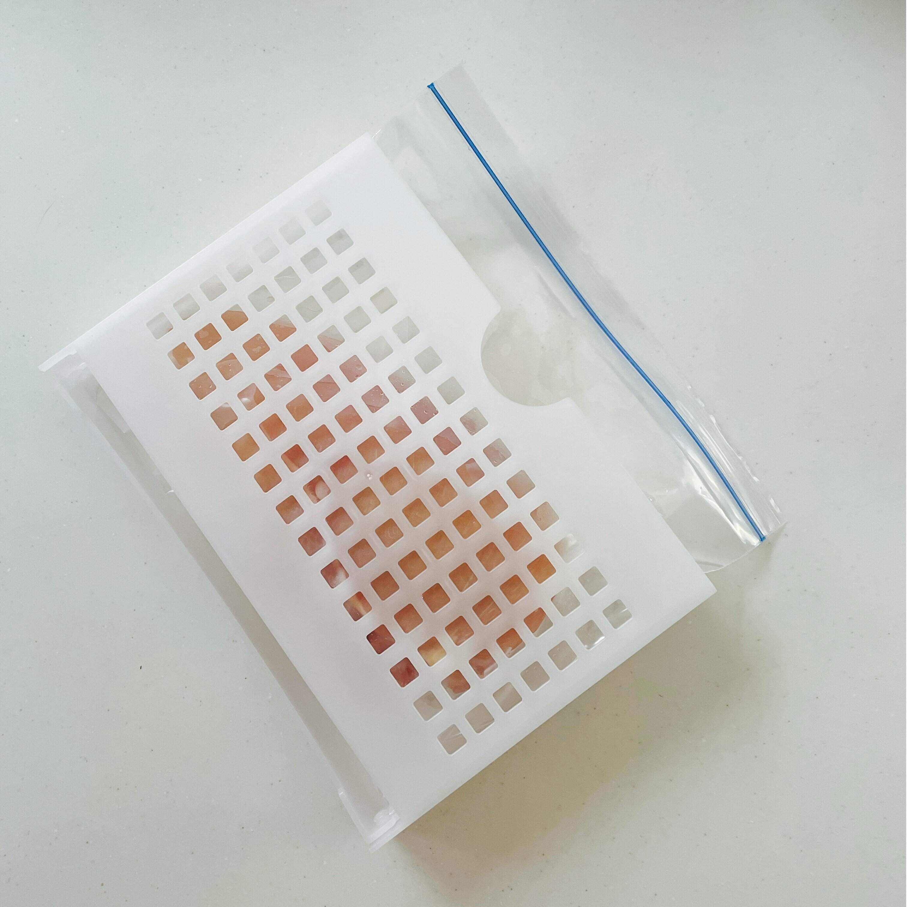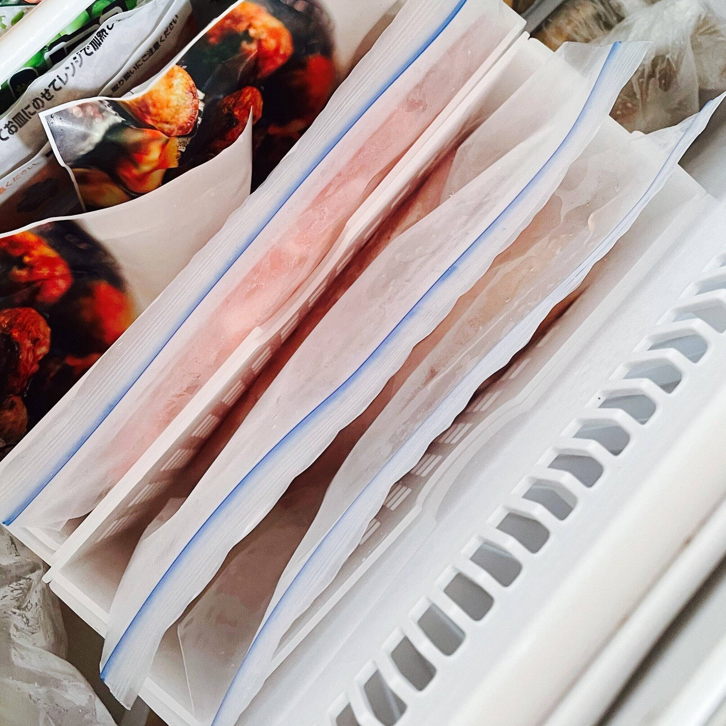 冷凍する物を入れた後は、このように閉じて冷凍庫へ!幅が3cmあるので厚みのある肉なども入れることができます。
