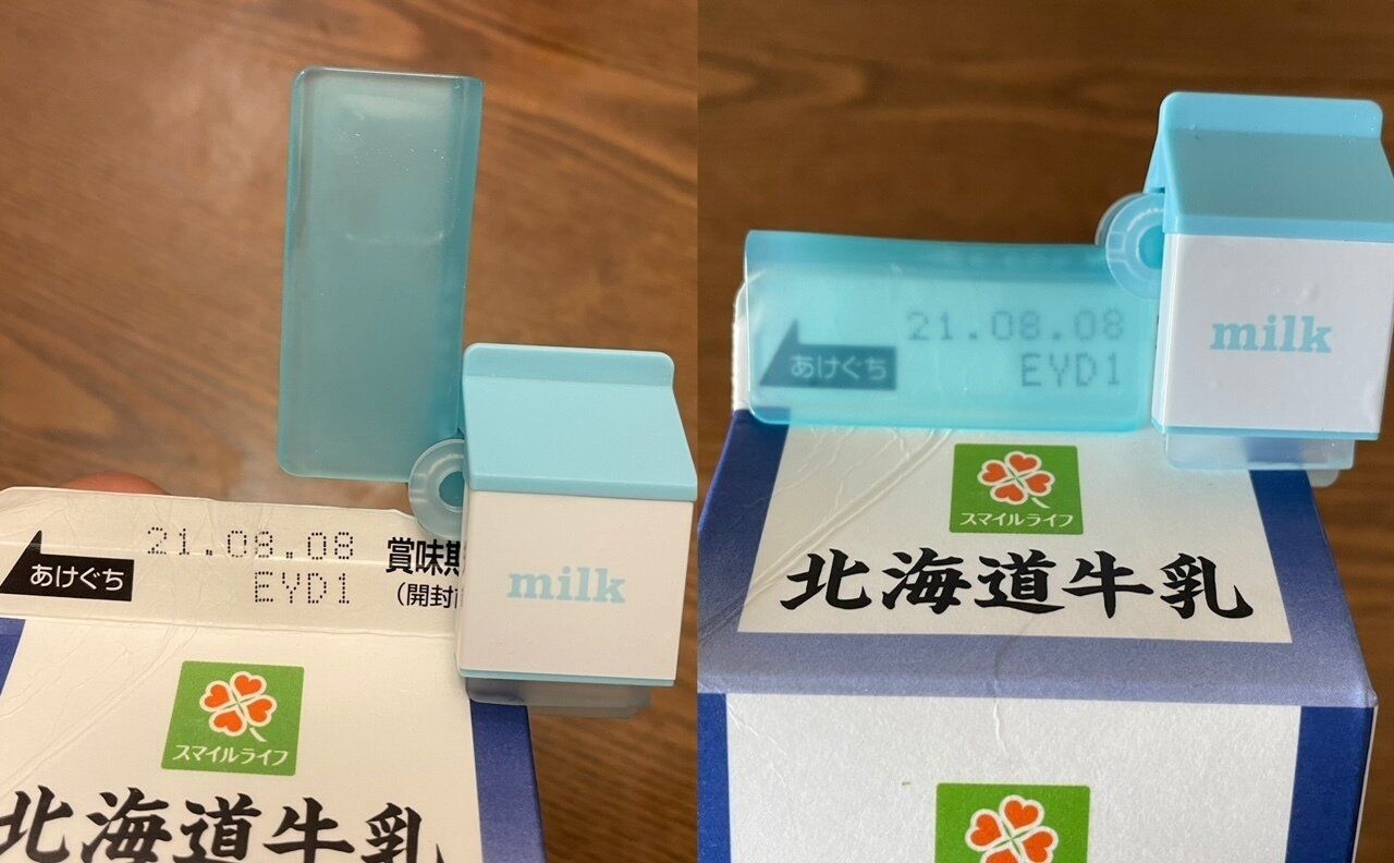 いくらかわいいクリップでも、牛乳を飲むたびにつけたり外したりしていては、面倒でそのうち使わなくなりそうです。こちらはクリップをつけたまま、「あけぐち」を開け閉めできて、そのままコップへ注げますよ。