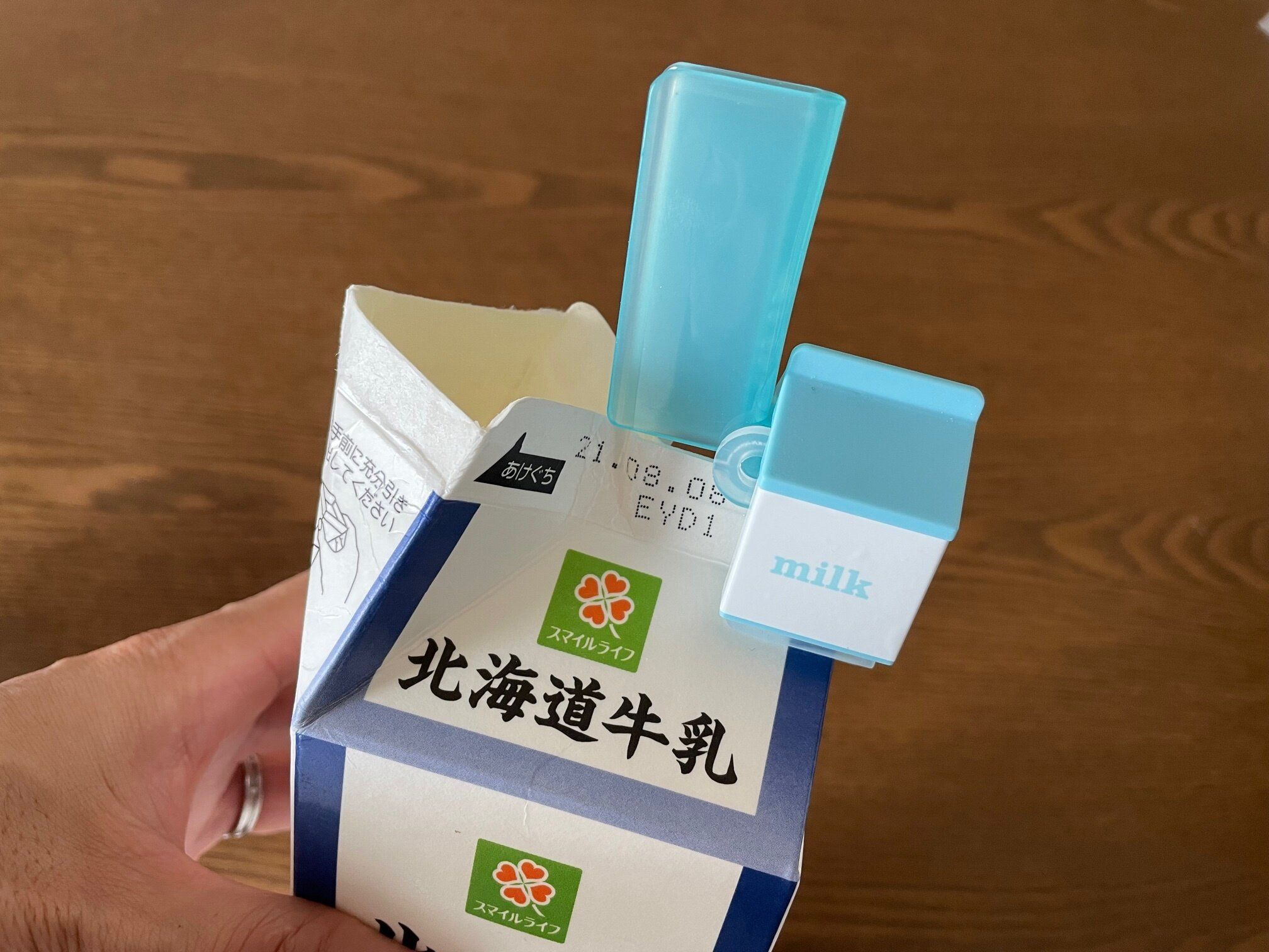 さっそく開封した牛乳に取り付けてみました。つけ方は簡単。クリップを上げ、紙パックの「あけぐち」ではない方に差し込みます。ピタッと気持ちよくしっかりとはさめますよ。あとはクリップを下げればOK。一度開けた牛乳のくちがきちんと閉まりました。