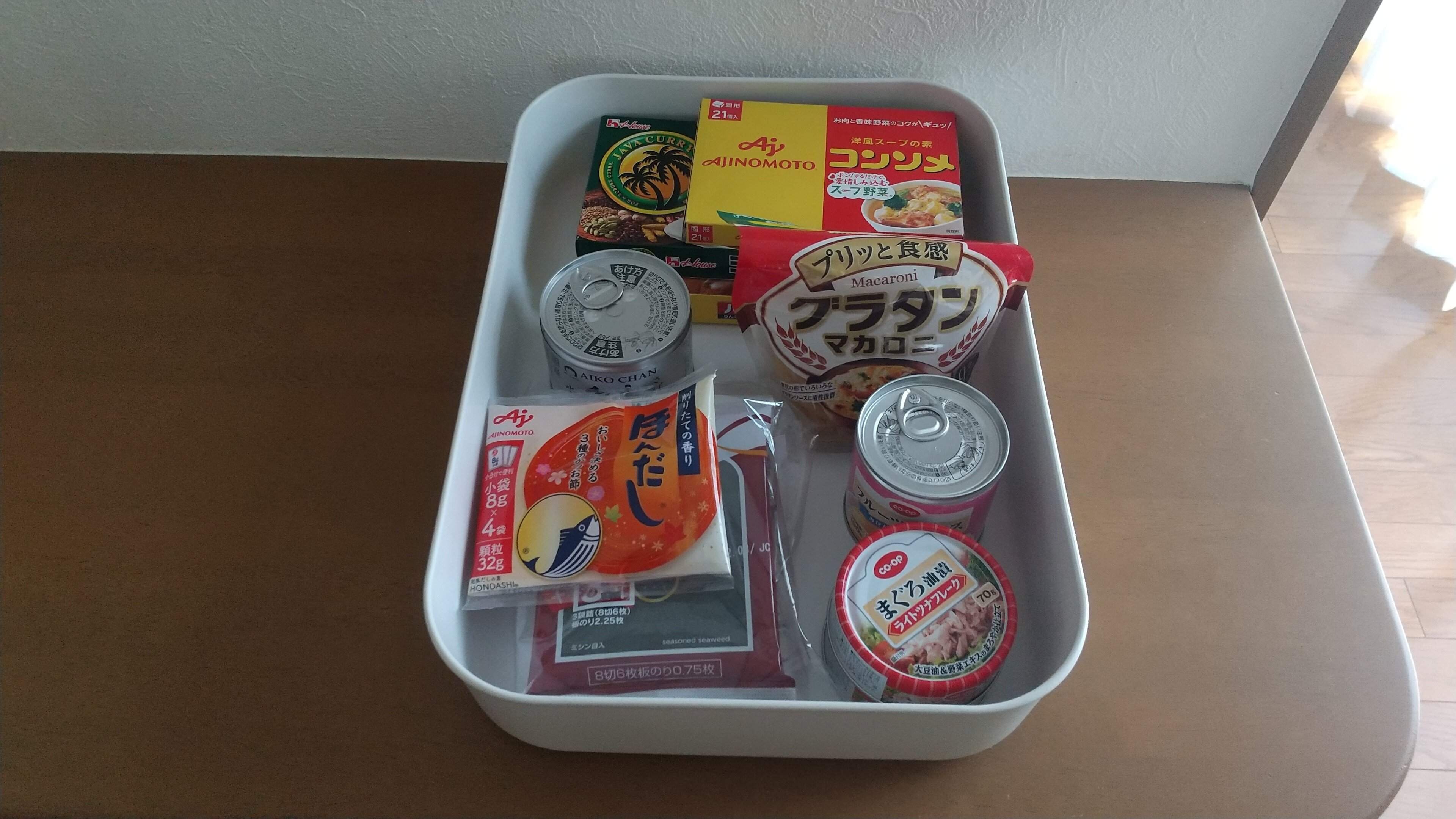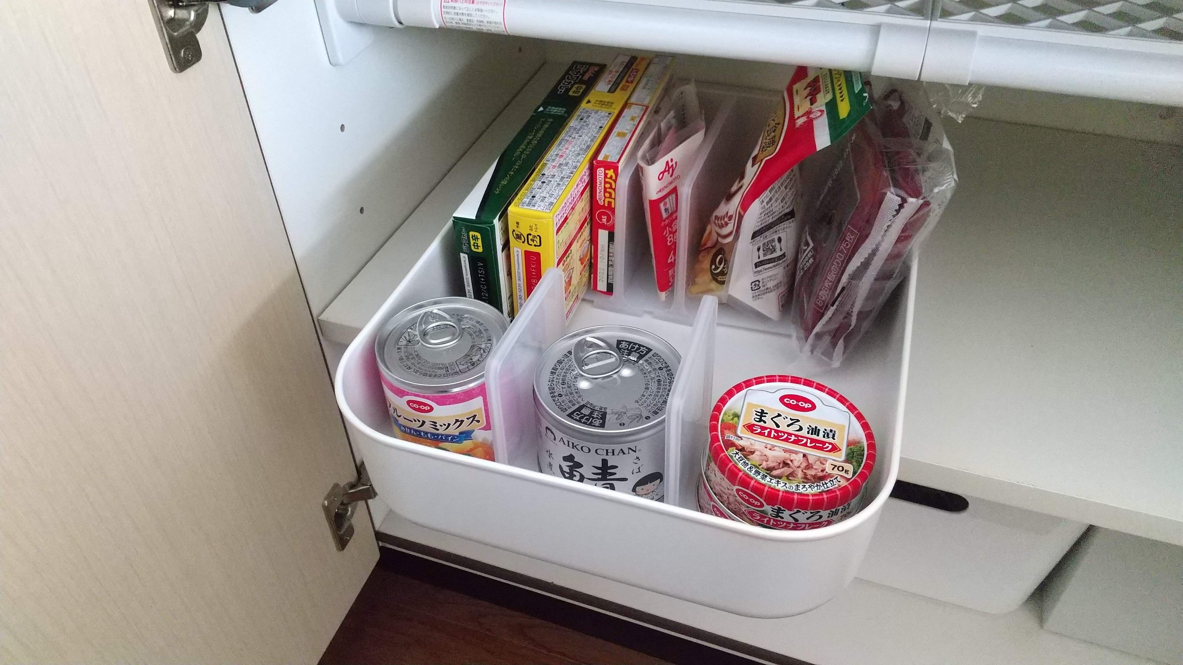 食品ストックは無印良品の「やわらかポリエチレンケース」に入れて収納しているのですが、ざっくり入れているがゆえに食品が重なり合ってしまったり、全体的にバラバラでわかりづらく感じていました。