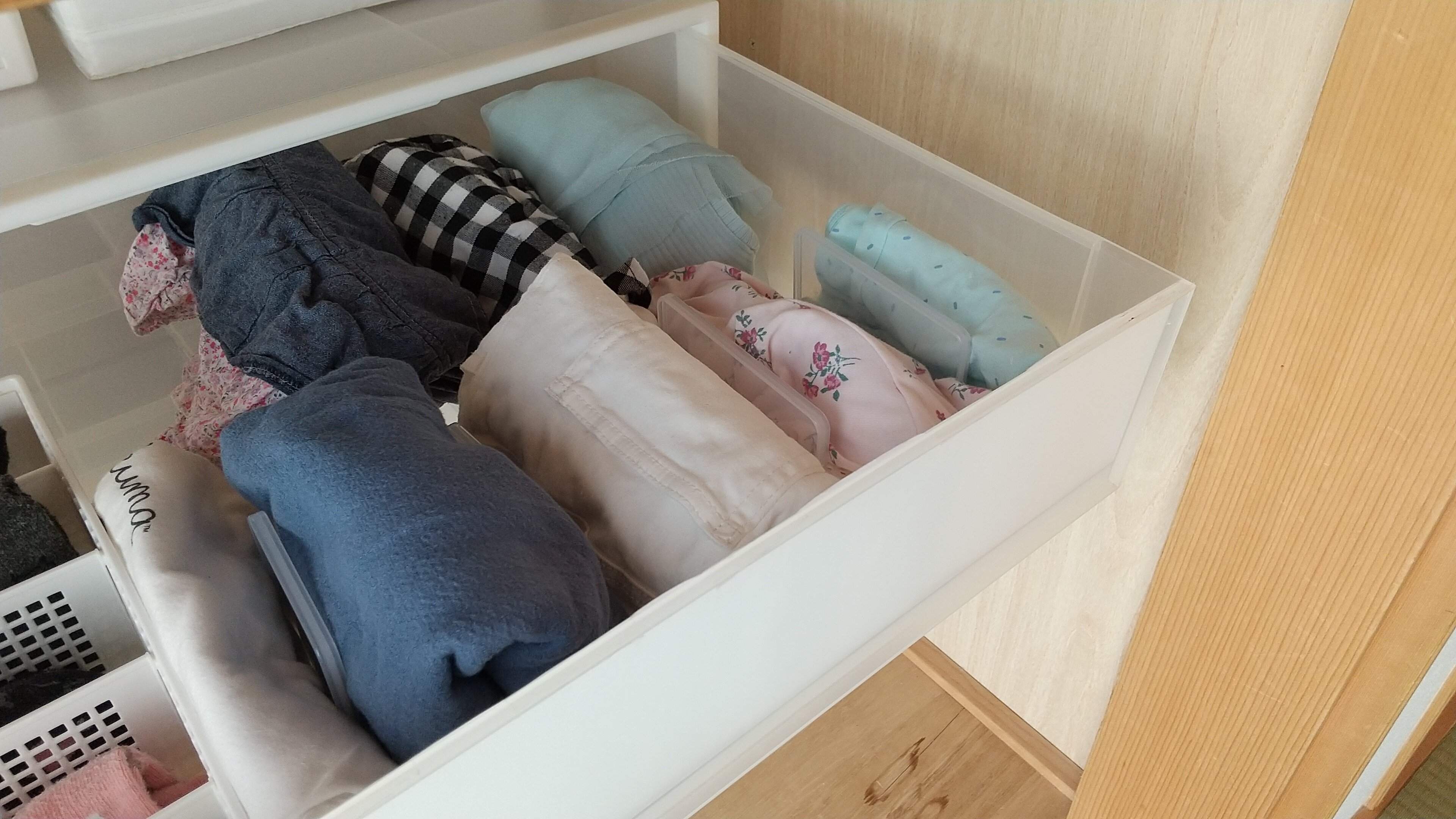 トップス・ボトムス・ワンピースなどアイテムによって服の厚みが違うため、うまく仕切るのがむずかしかったのですが、これならピッタリの位置に簡単に仕切れてキレイに収納できるようになりました。