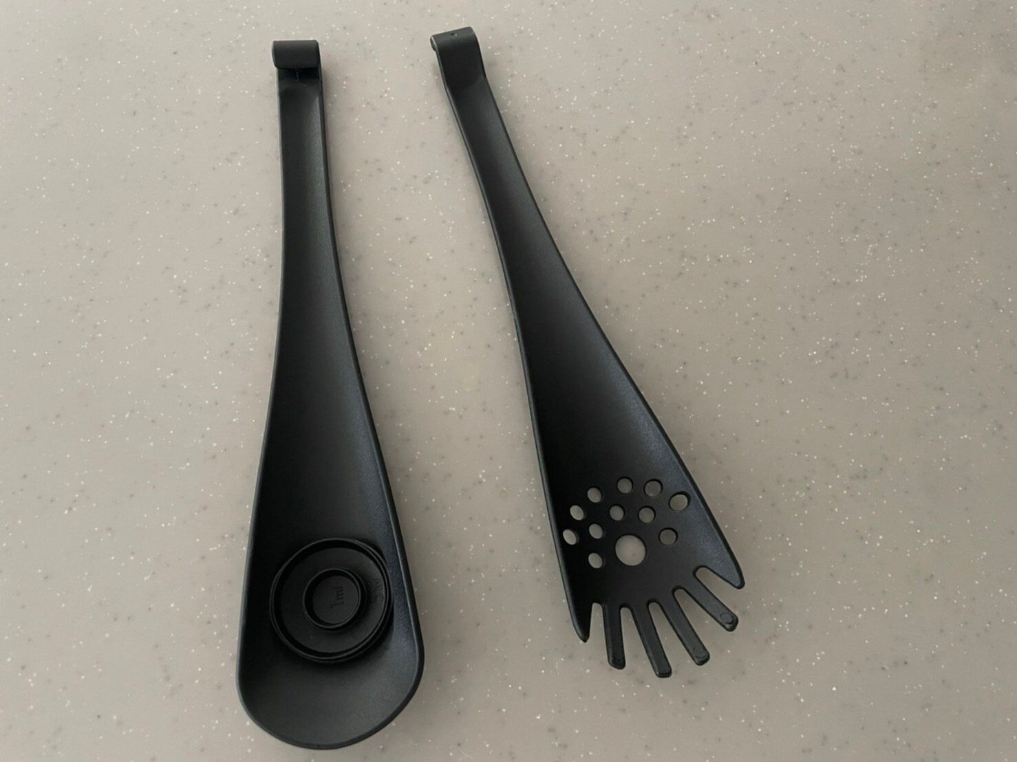 こちらのトング、上部のジョイント部をスライドするとセパレートすることが可能で、スプーン部分とフォーク部分に分かれます。料理によって使い方を変えながら大活躍するというわけです。