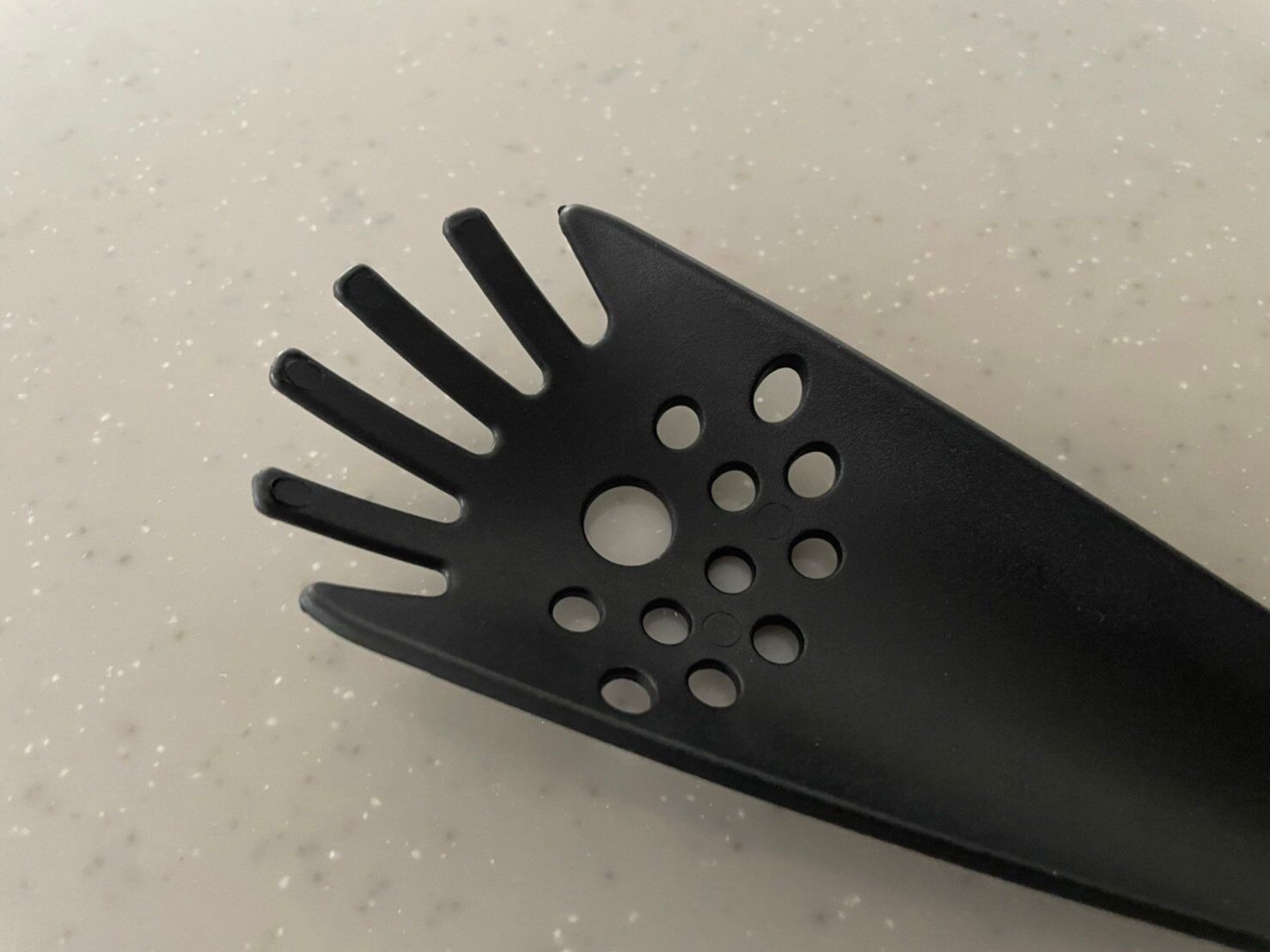 セリアの「多機能トング」は、なんと1つで「トング」「軽量スプーン」「湯切り」「フォーク」「スプーン」「炒める」の6役に使える優れもの。