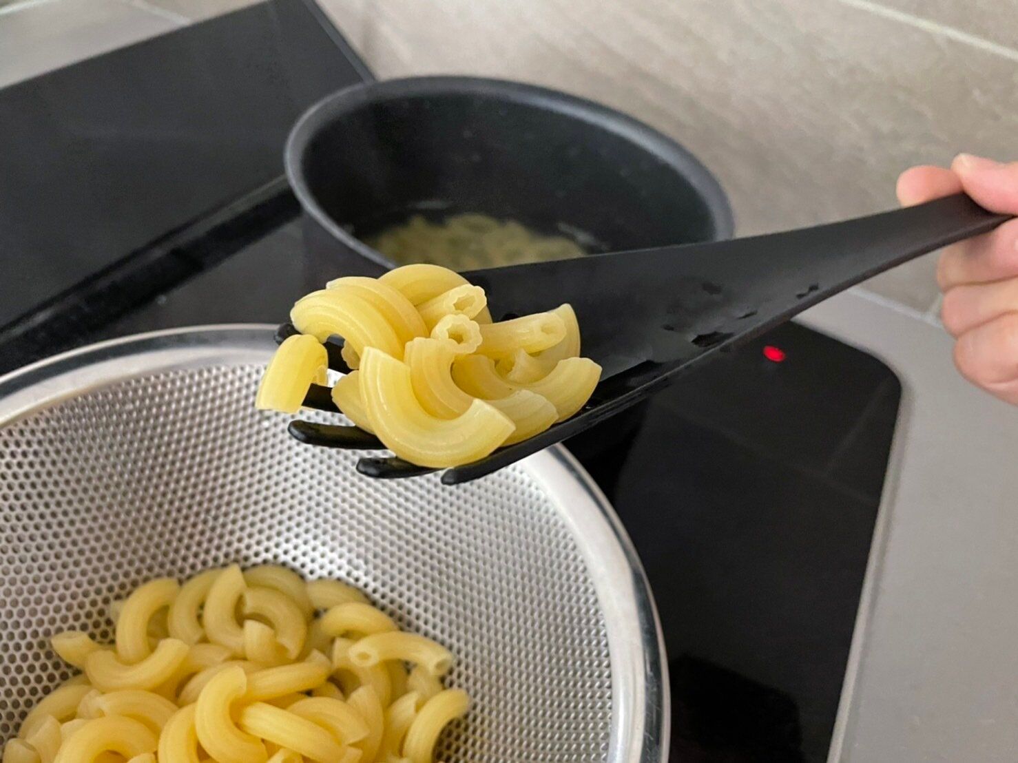 フォーク部分では、麺類の湯切りや、写真のようなマカロニの湯切りに便利です。そのままボウルに移し、混ぜるところまで1本で活用できます。