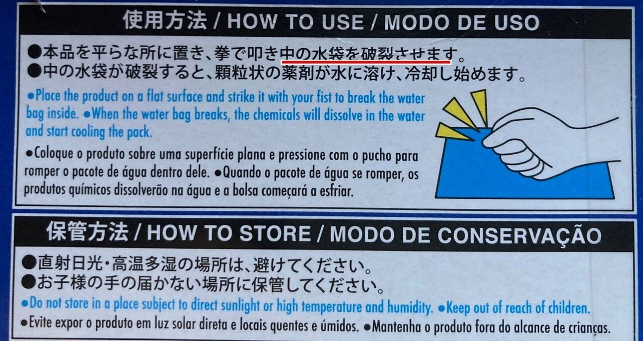 なぜ冷たくならないのか……あらためてパッケージをよく見ると、裏面にちゃんと説明がありました。「拳で叩き中の水袋を破裂させます」とのことで、「瞬間冷却」と書かれた袋の中には水袋というもうひとつの袋が入っていて、それが破裂しないことには冷たくならないというわけです。説明書はしっかり読まなければいけませんね。