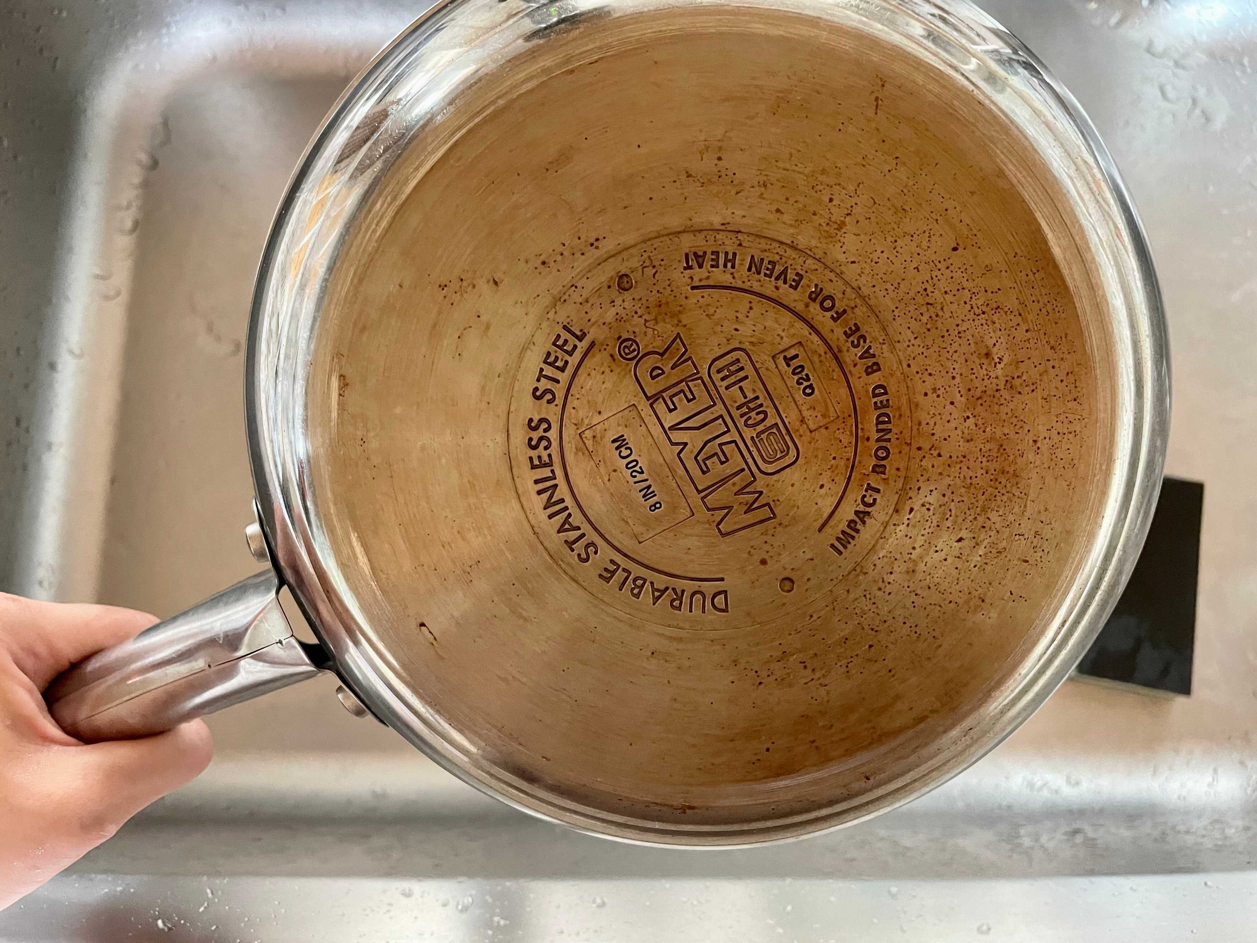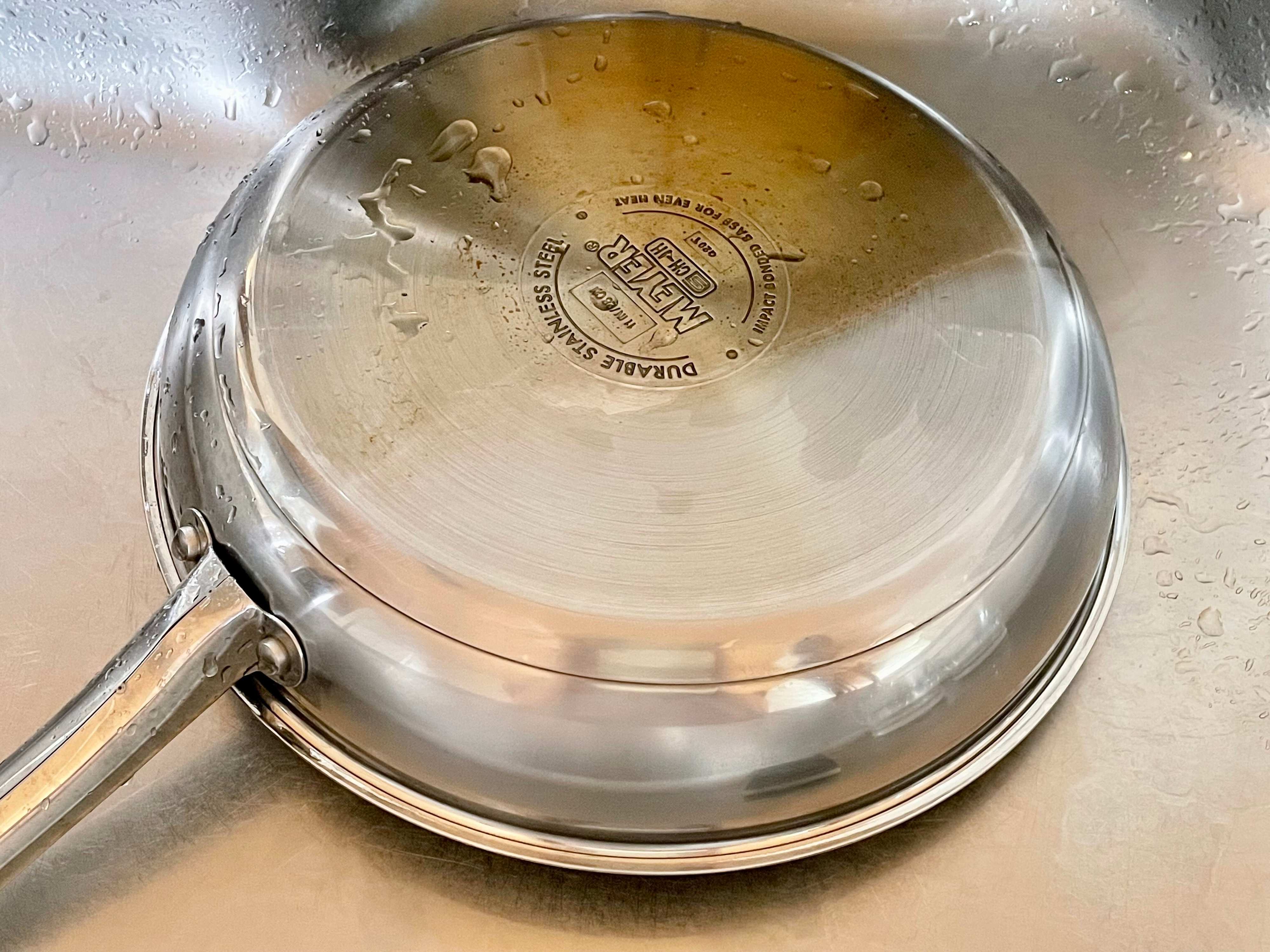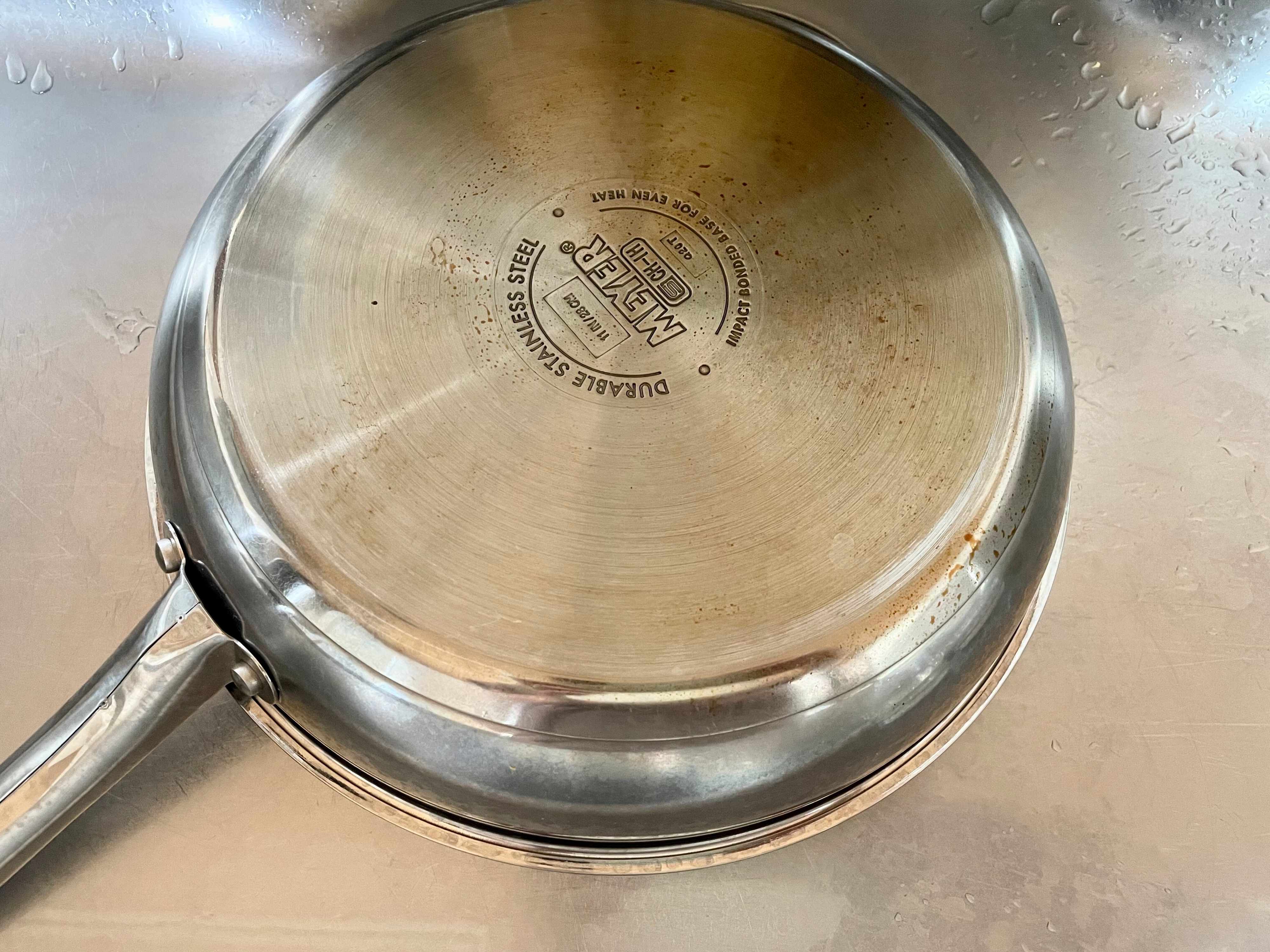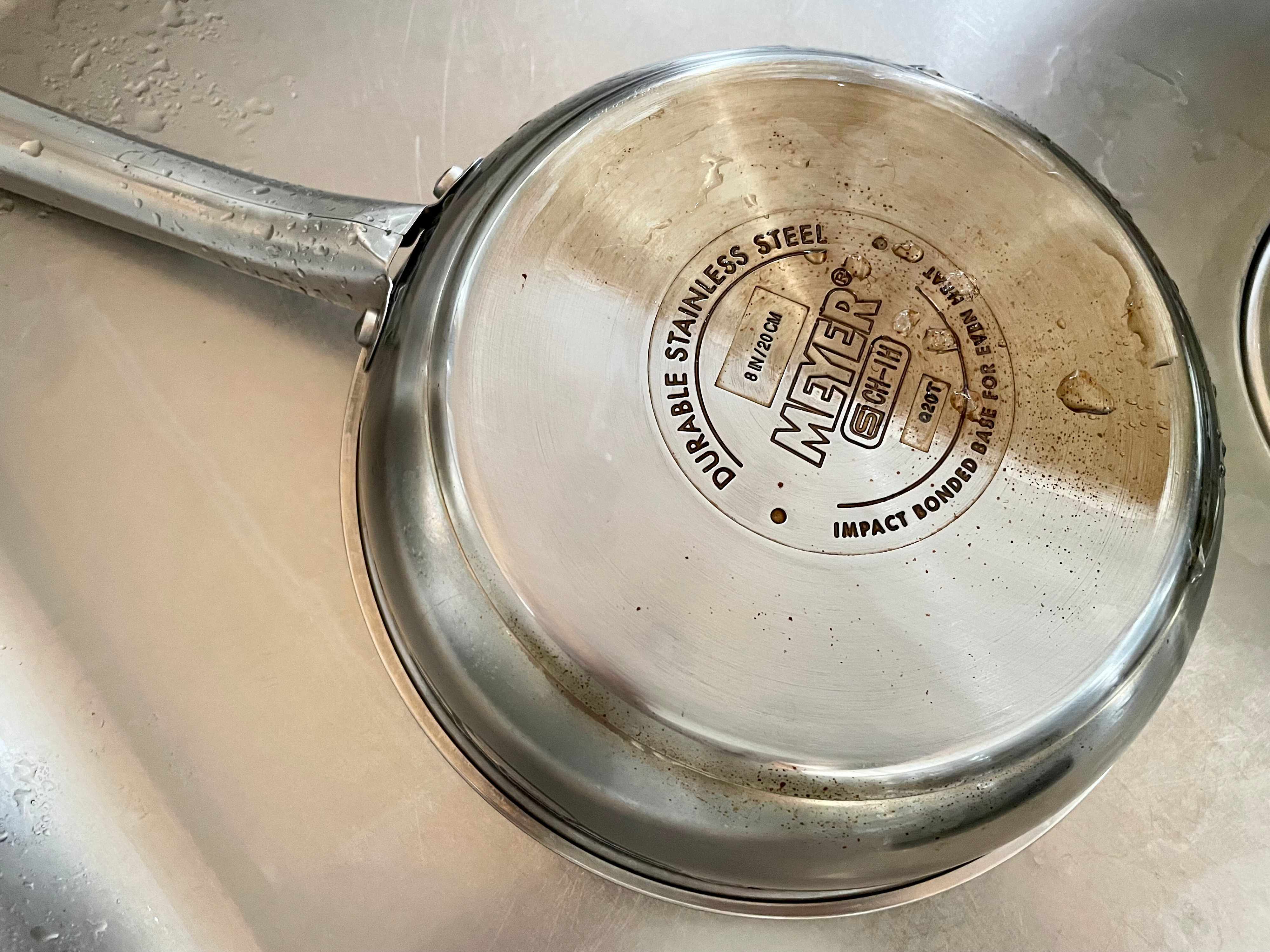 水だけで簡単に落ちるステンレス鍋みがき。小さなキズはついてしまうものの、フライパン裏なので私は全然気にならない!