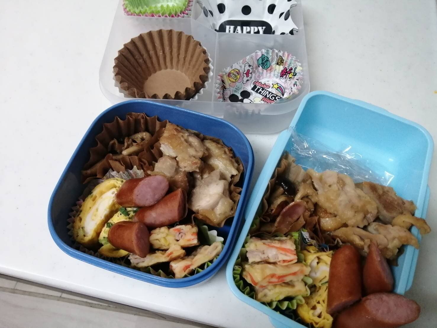このような感じで種類がバラバラのおかずカップの数々。いつもならば統一感も無く見事バラバラになります。