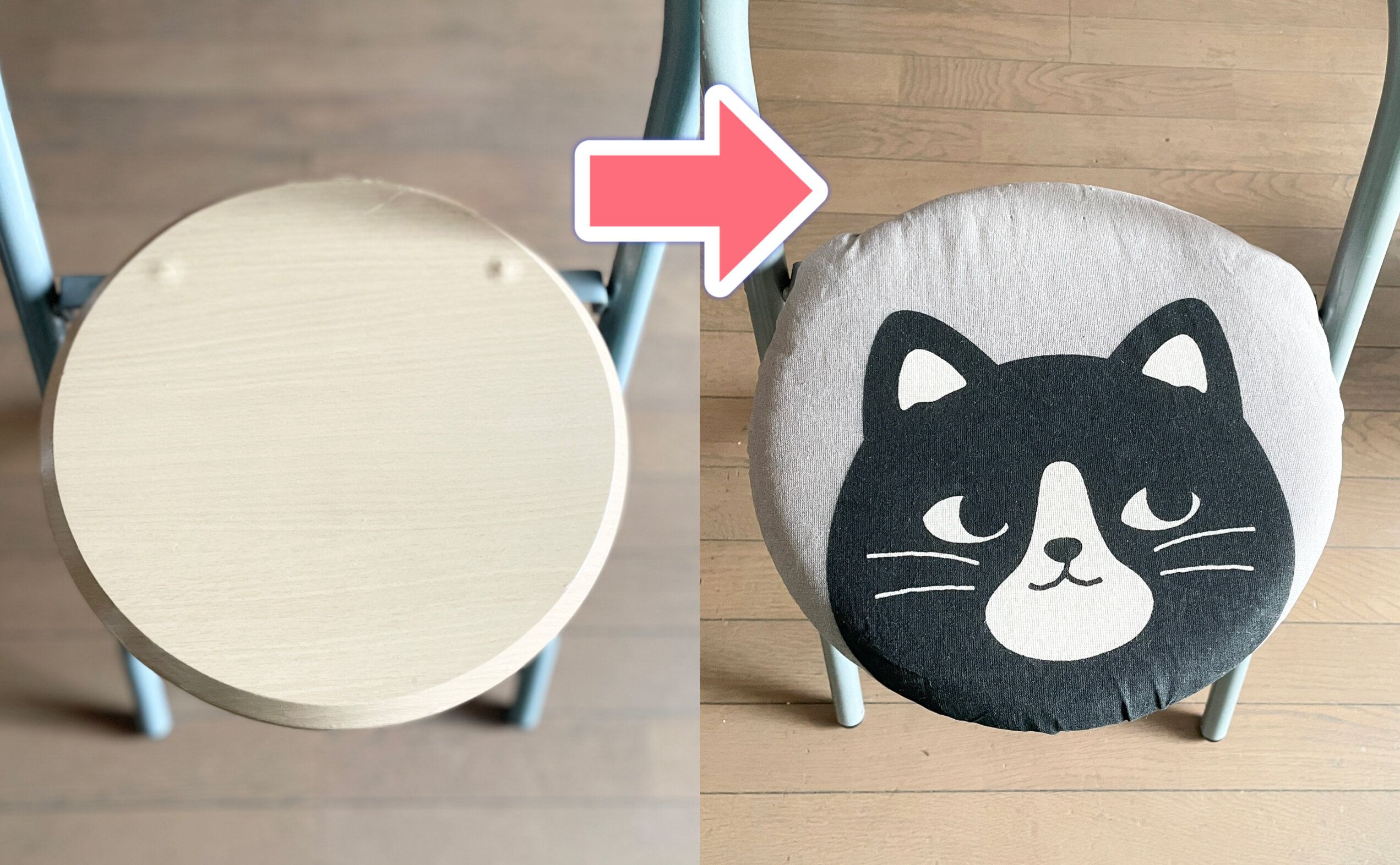 「いつものイスにちょっと飽きてきたな」と思ったとき、すぐに雰囲気が変えられていいですよね。シンプルな木目のイスが、一気にオシャレ風になりました。