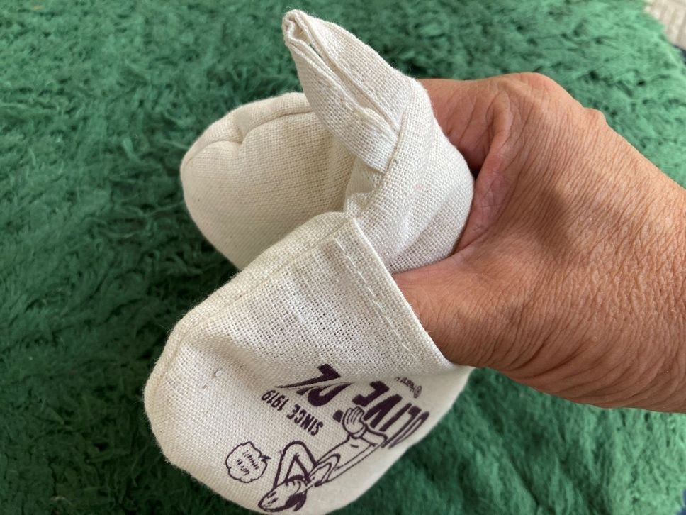 素材は布製で、長さ20cm×幅12cm。親指を一方に、それ以外の指をもう一方の袋に入れてお皿を挟むタイプです。引っ掛ける輪っかがあるので、キッチンにあるフックに引っ掛けることができます。