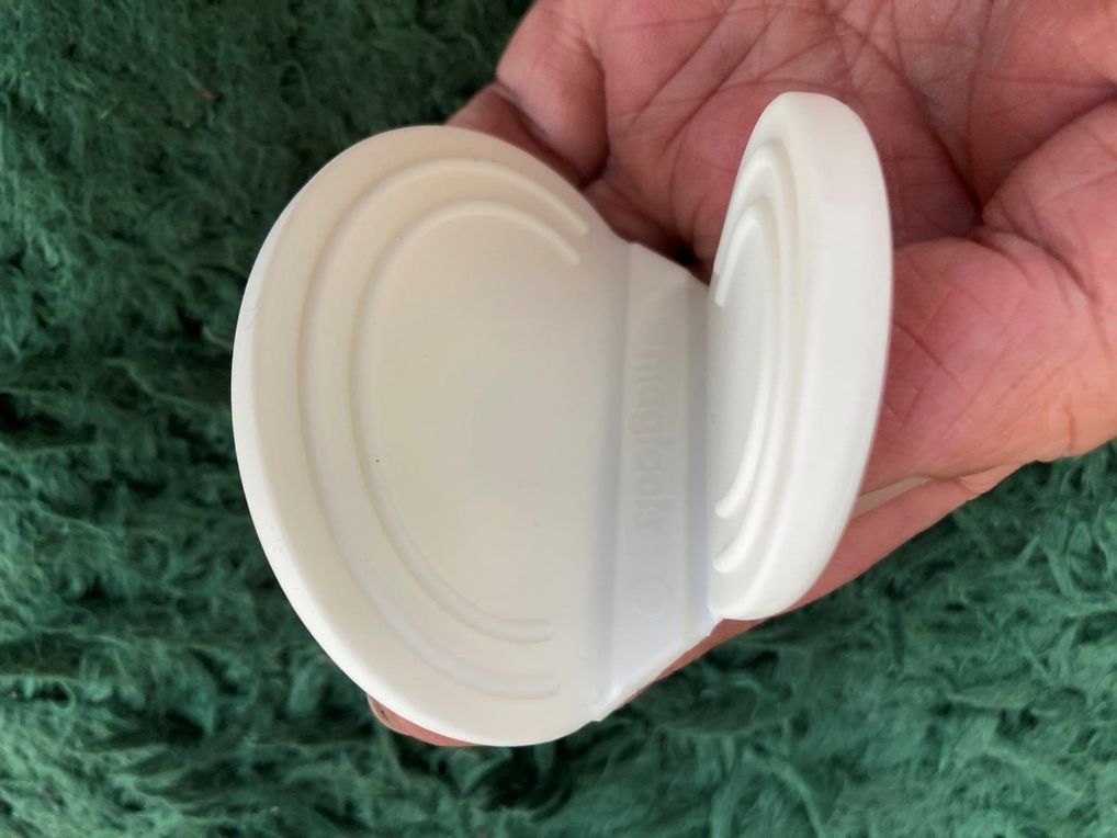 サイズはとても小さいので、冷蔵庫に貼っても邪魔になりません。柔らかいゴム素材で、耐熱温度は80℃です。小さなお皿を、片手で電子レンジから取り出すのにピッタリなサイズ感です。