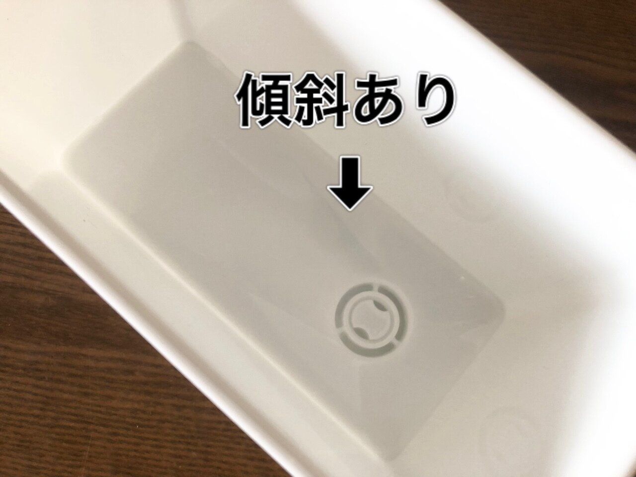内側は、排水ノズルへ続く穴へ向かってきちんと傾斜がついており、水が溜まらずしっかり流れる仕組みになっています。底がメッシュにはなっていませんが、水はきちんと切れますよ。