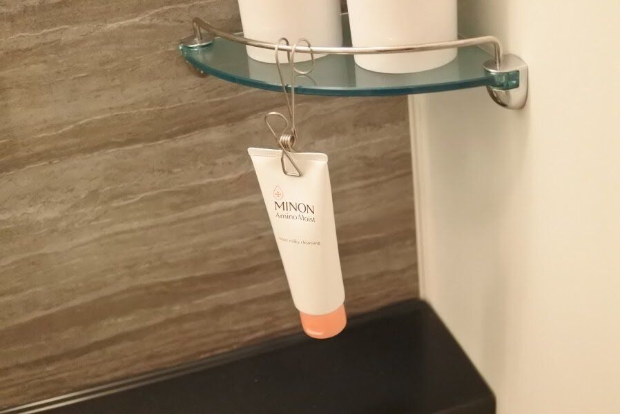 ただ、洗顔料を出そうとした時にワイヤークリップが外れてしまってクリップをつけ直さないといけないことってよくないですか?しかも、ステンレスなので石鹸カスがついてしまうと落とすのに結構大変だったりするんです。これが意外とプチストレスで、直置きする方がラクな気もしてきて最近までひっかけ収納をやめていました。