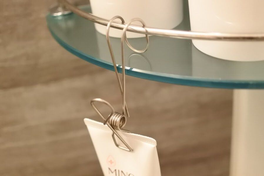 浴室で使う洗顔料やメイク落とし、立てて直置きするとどうしても水滴やヌメリ問題が。そこで無印のステンレスワイヤークリップを使ってひっかけ収納をすることで解決!