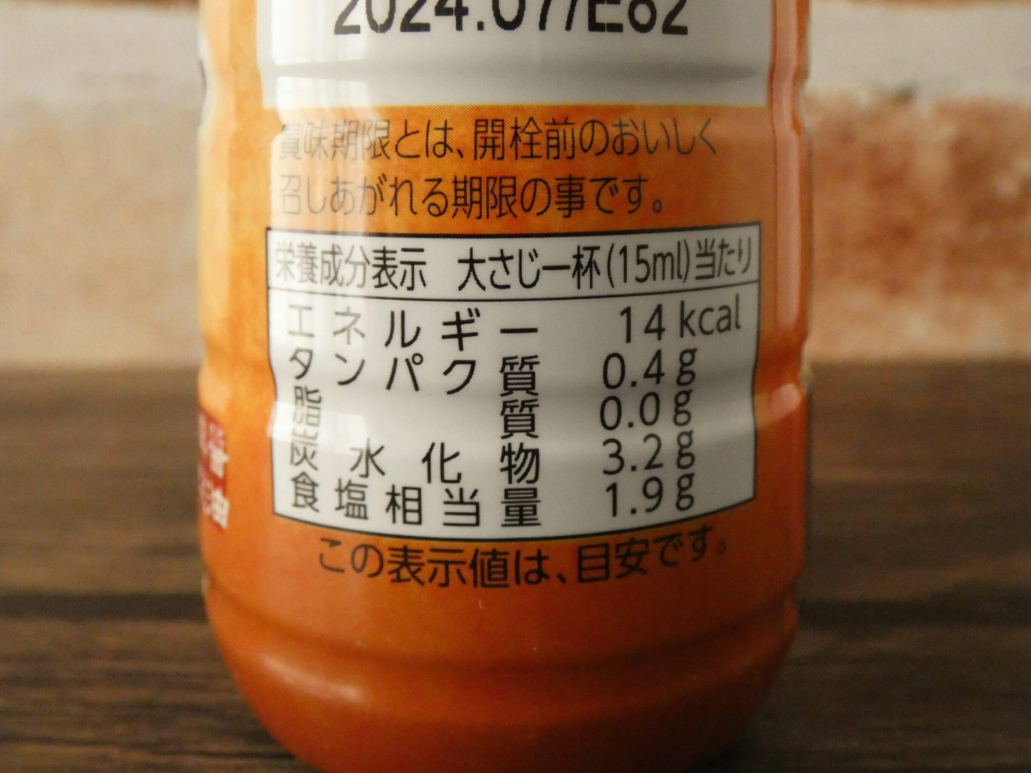 栄養成分表示を見ると大さじ1杯(15ml)のエネルギーは、14kcal。食塩相当量は1.9gなので、色合いは薄口しょう油のようですが、塩分は濃口しょう油よりも少ないです。