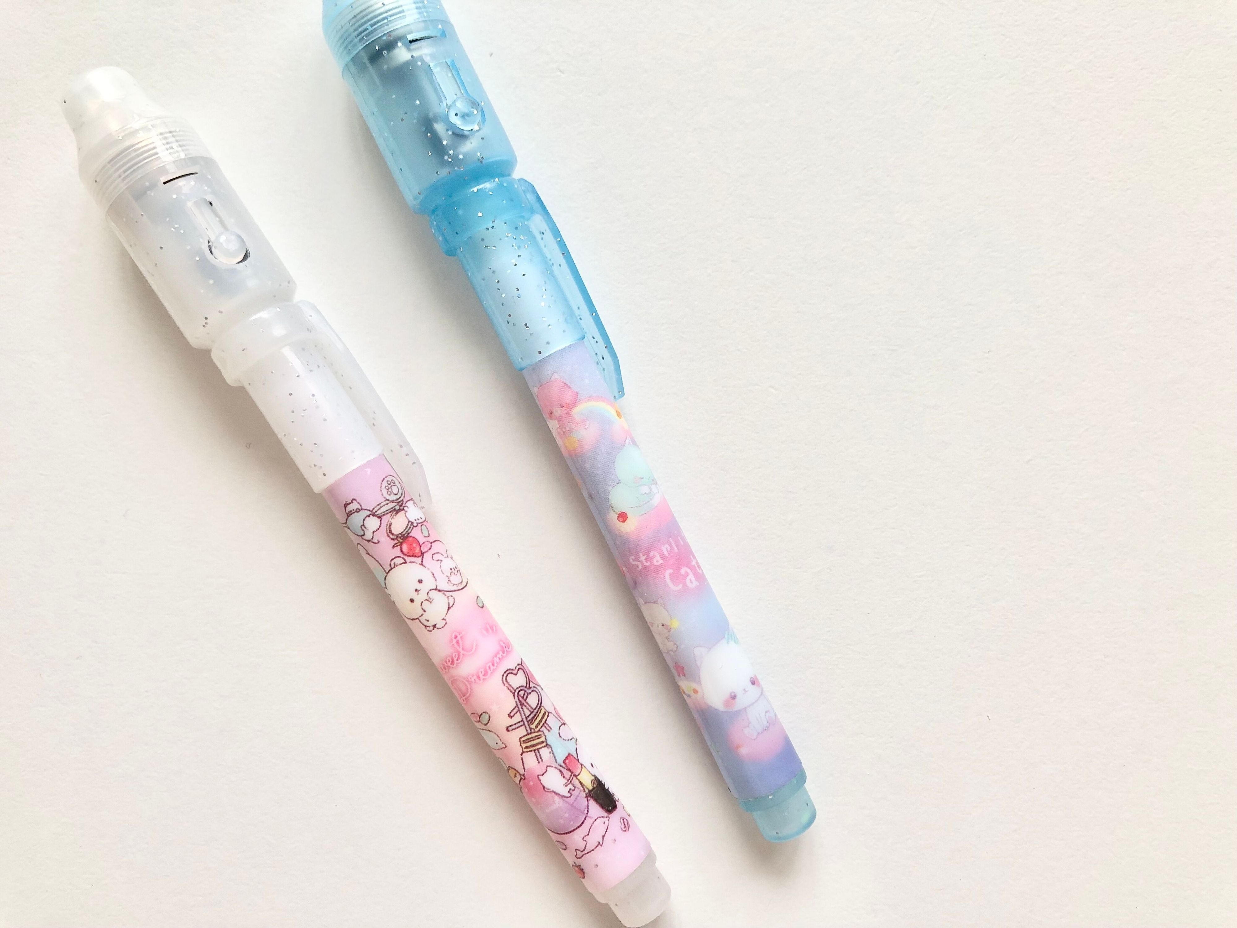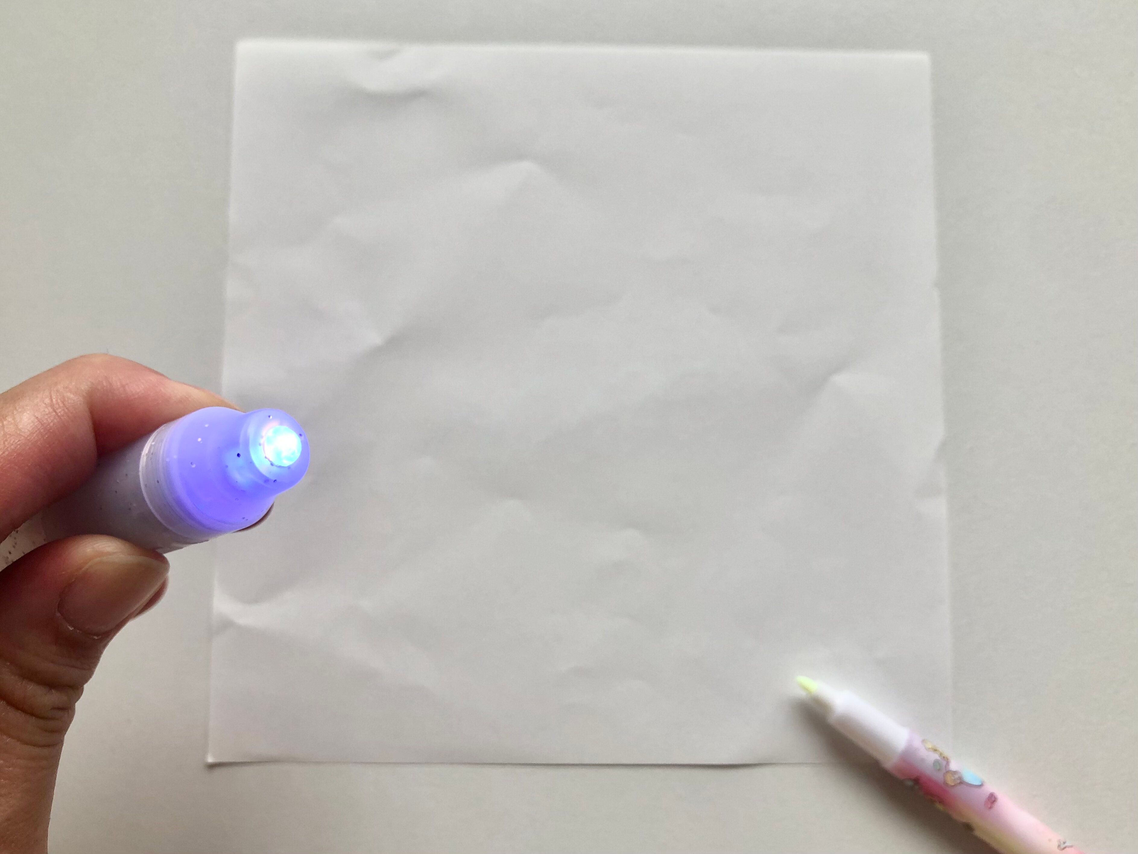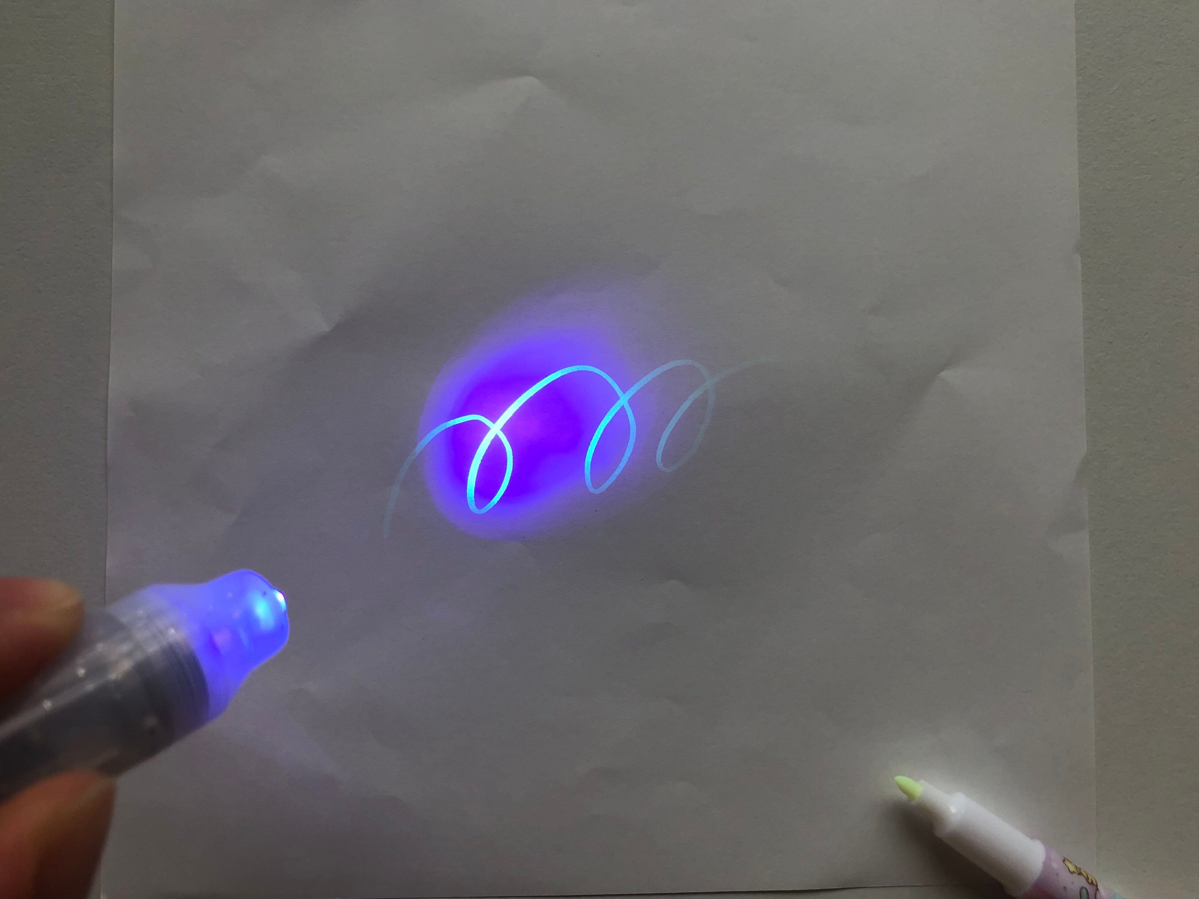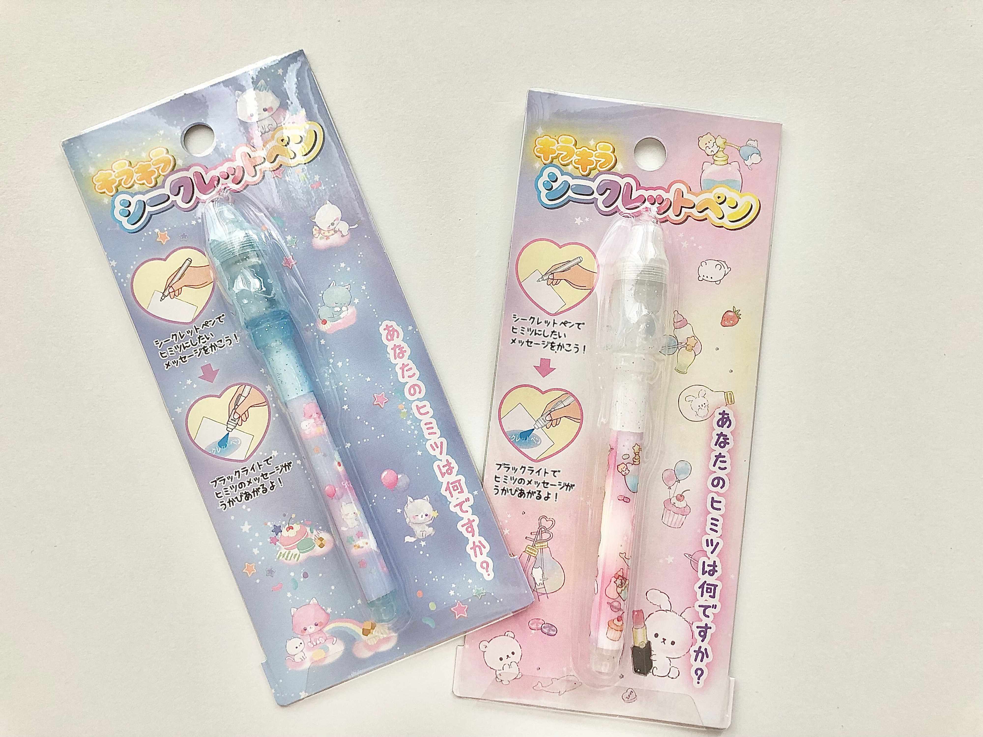 つまり、書いた文字にブラックライトの光を照射すると字が読めるようになる、とっても面白いペンだったんです!