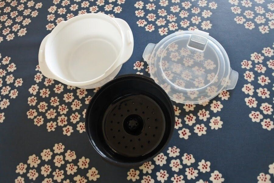 容器、加熱のムラを防いで蒸気を容器全体へ循環させる凸型中子、フタの3点セットです。