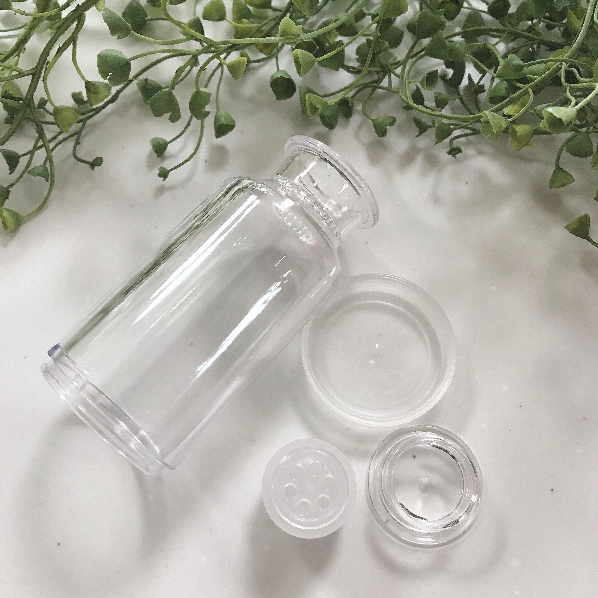 パーツは全部で4つ。ボトル・底のふた・中栓(小さい穴)・キャップ。