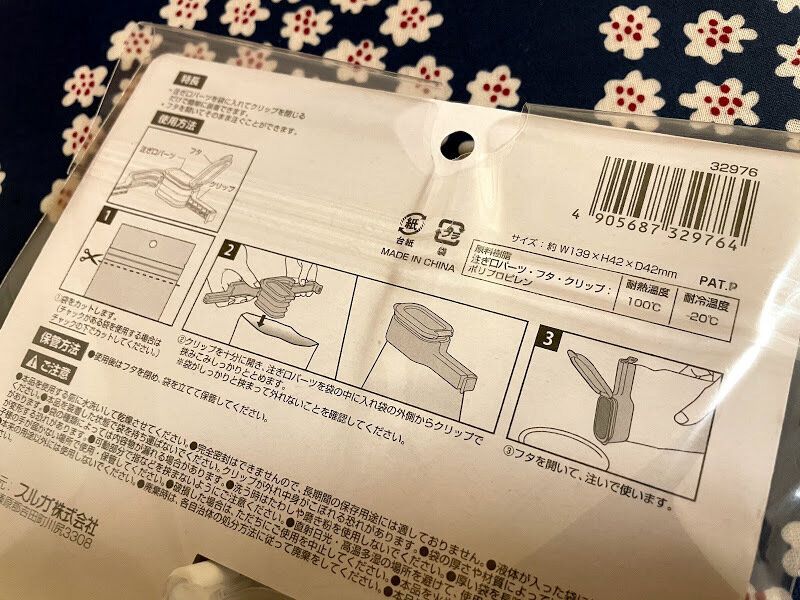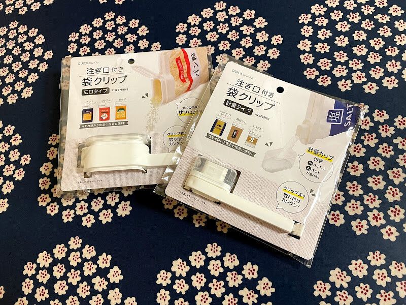 100円ショップセリアで見つけた『注ぎ口付き袋クリップ』。広口タイプと計量タイプの2種類ありました。