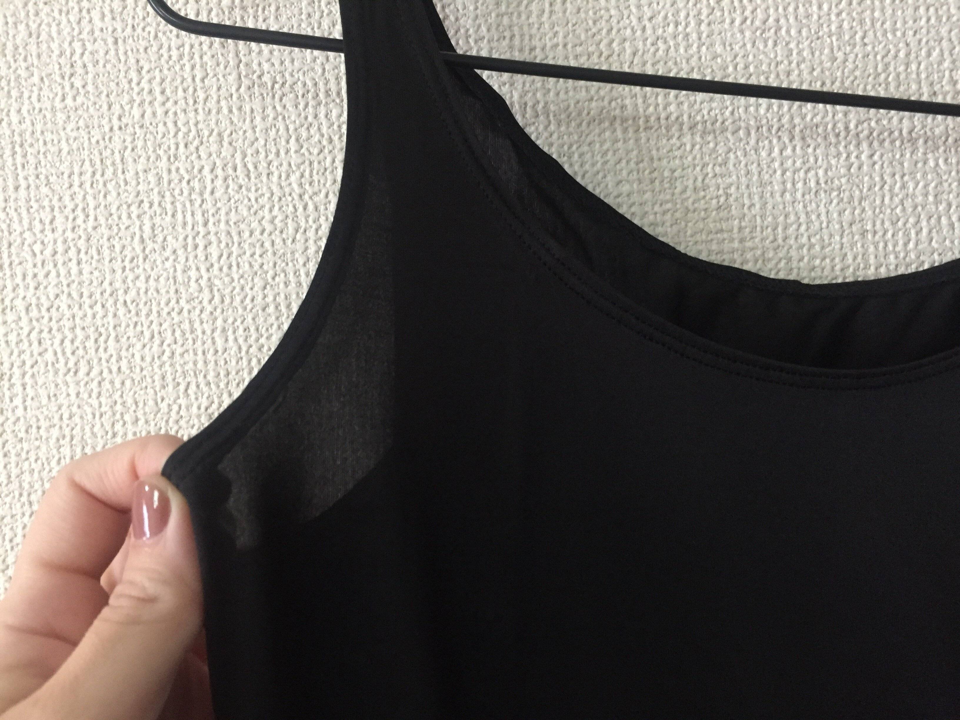 生地はやや透け感があります。ブラックを購入したので下着がもろに透けるということはなさそうですが、あくまでもお洋服のインナーとして着用するためのアイテムとして使う事をお勧めします。