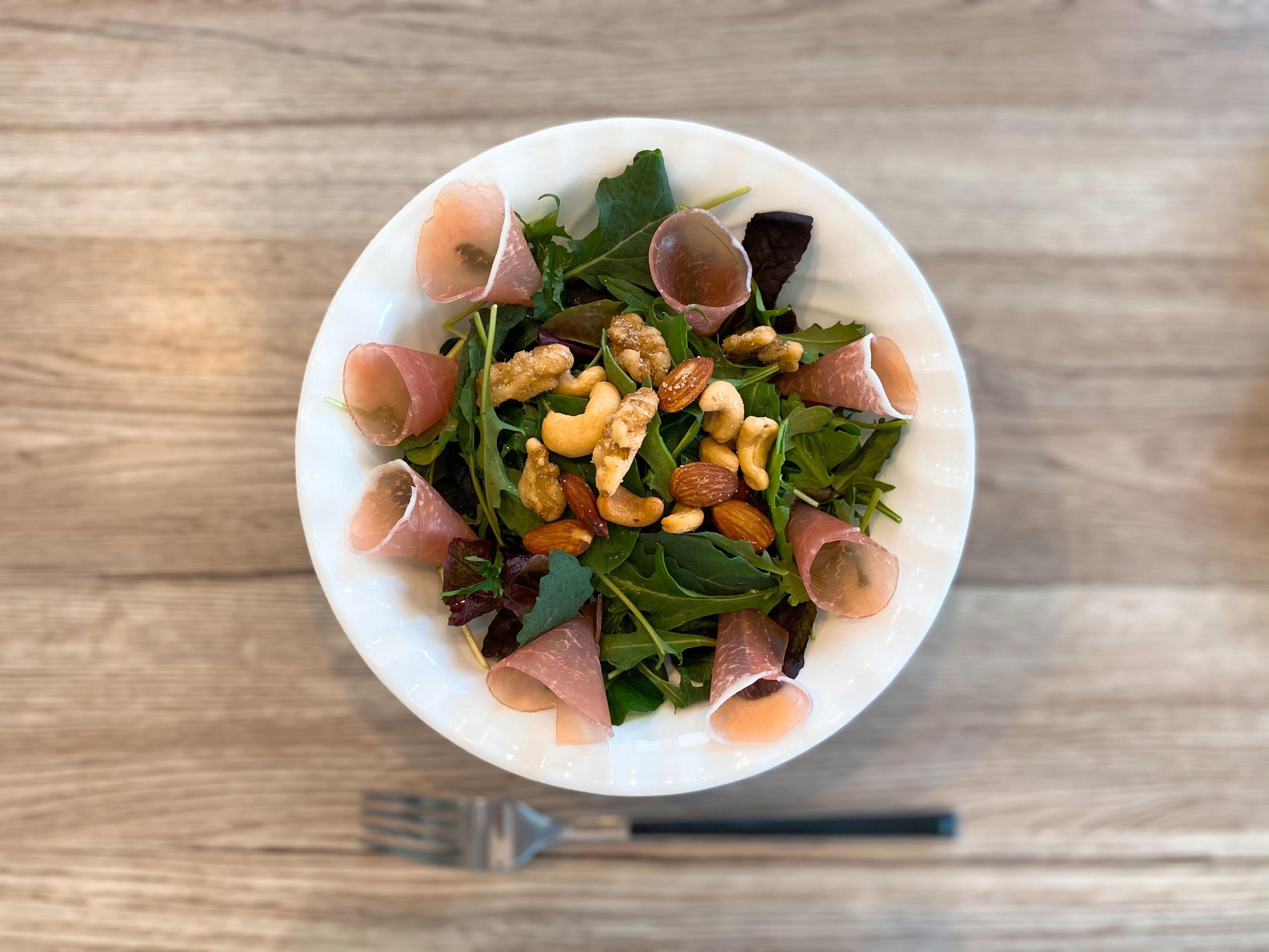 ベビーリーフと生ハムのサラダに、「白と黒のトリュフ薫るミックスナッツ」をトッピングしてみました。生ハムの塩味とナッツの塩味が重なり、ドレッシングなしで食べられます。